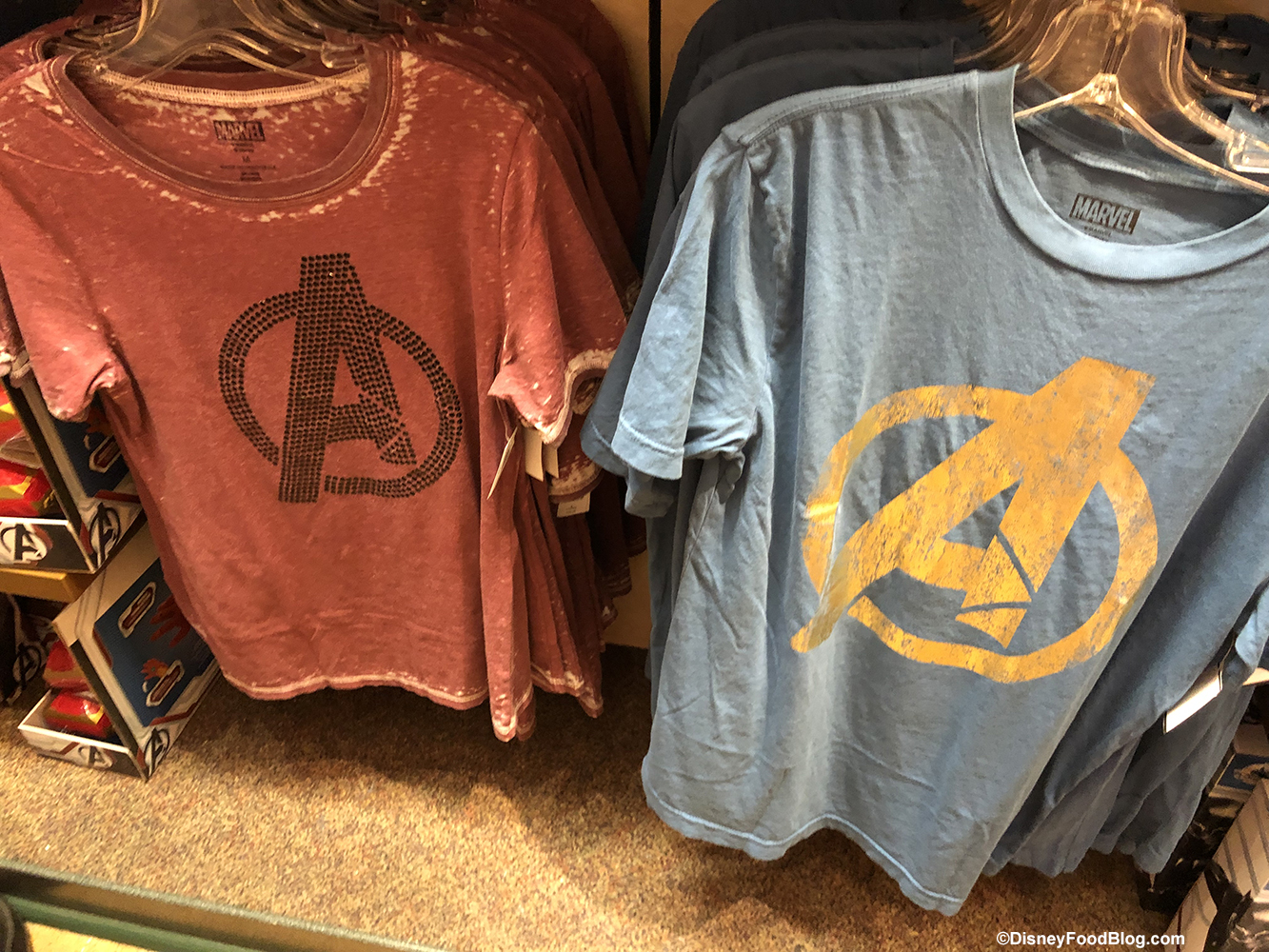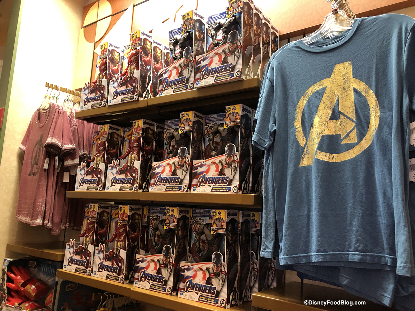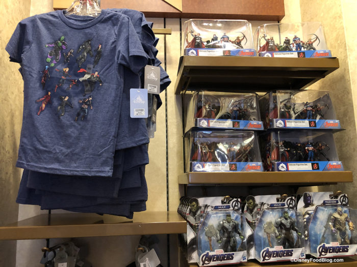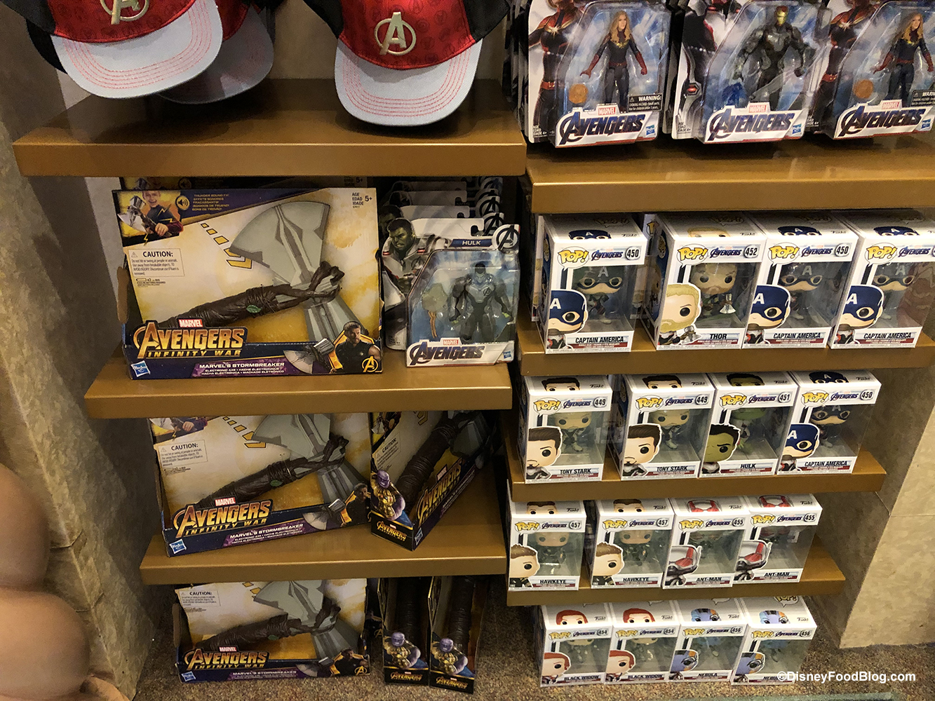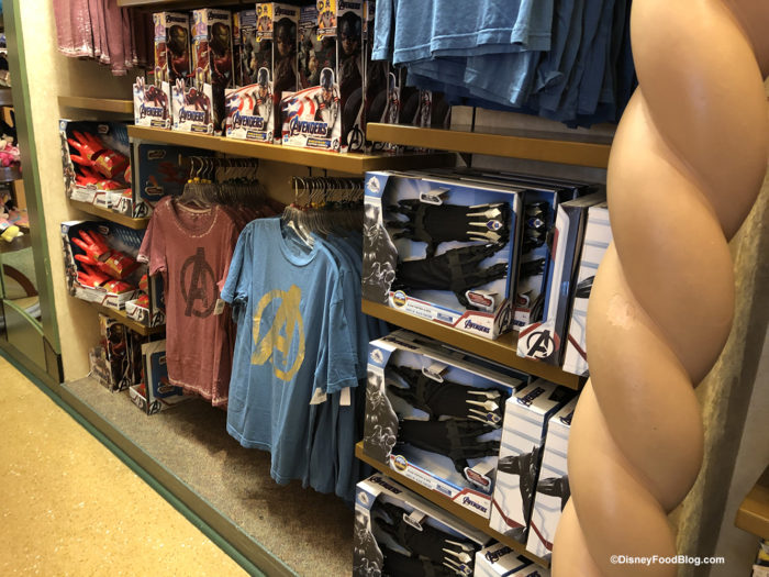 The shelves are full of Avengers merchandise — there are play sets, shirts, action figures, Funko Pops, and more!