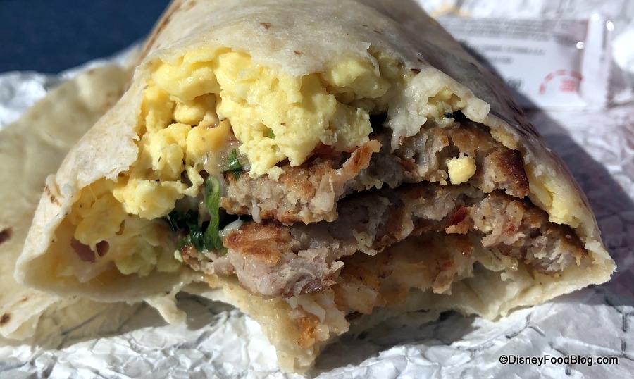 The Burrito is packed with sausage, egg, bacon, hash browns, cheese, and pico de gallo. That’s three sources of protein, a starch, and some fresh pico.