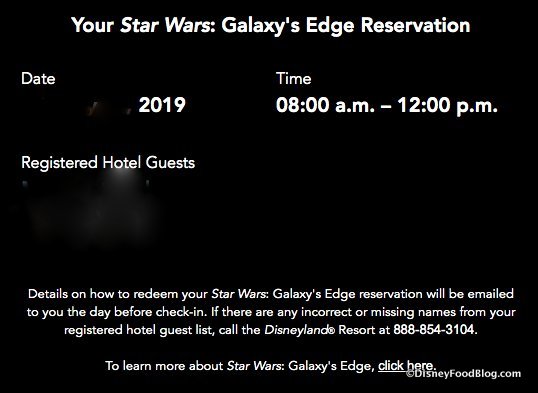 Finer details include statements that guests will be required to leave Galaxy’s Edge at the end of their reservation time period, and — because the email also includes a pre-assigned time — that modifications to reservations are subject to availability.
