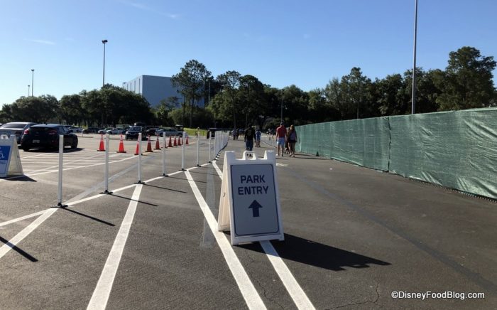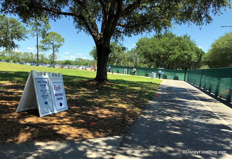 With the regular tram stop closed for refurbishment, guests parking their cars will still utilize the east and west lots, but will approach the entrance from the sides (as opposed to right down the center path with Spaceship Earth directly in view).