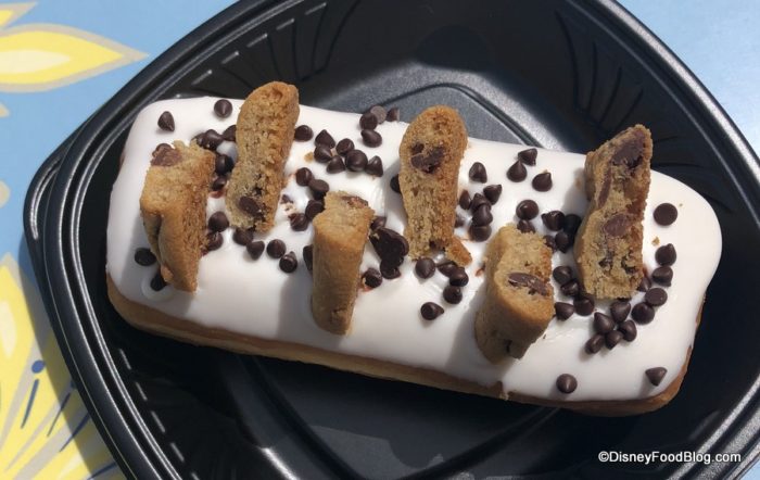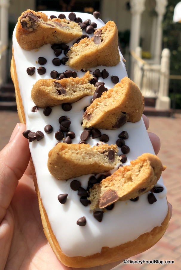 This is a yeast donut with white glaze, mini chocolate chips, and, of course, the cookies.