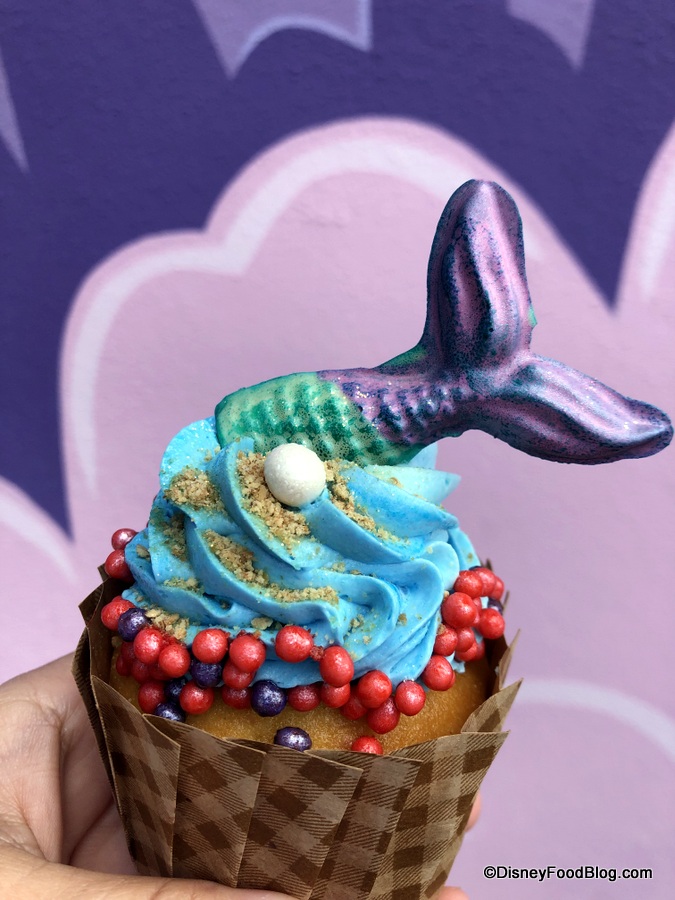 The cupcake’s colors really make a splash! They’re a total nod to Ariel since they happen to be the colors of her hair, shells, and fin!