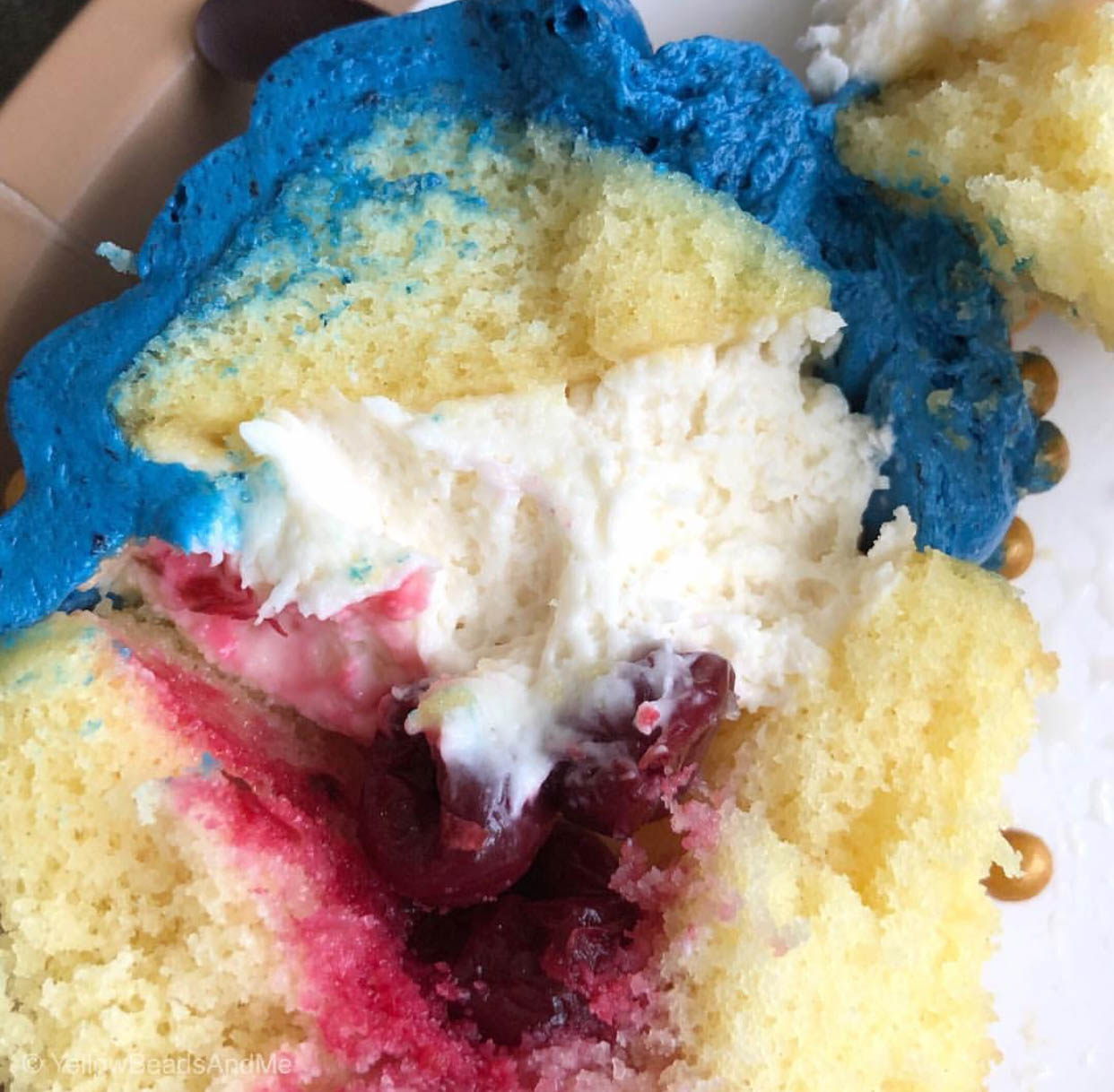But believe it or not, as intense as the exterior is, it’s the inside that really wows. The yellow cupcake is STUFFED with Cherry Cheesecake. Yes: CHERRY CHEESECAKE. Our Inst-pal @YellowBeadsAndMe says the inside is delicious! (How could it not be, right?!)