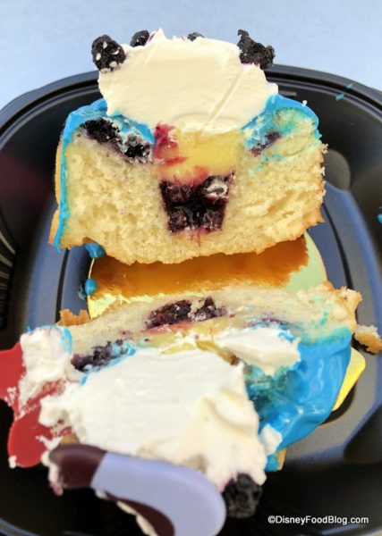 The cake is filled with lemon curd and blueberry compote. See the full review here!