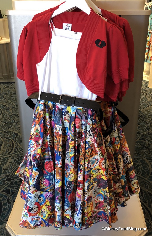 At The Dress Shop, you can pick up this dapper Mickey Mouse Dress complete with cardigan, belt, embroidered MM, and colorful skirt covered in the many faces of Mickey Mouse (in addition to iconic Disney images)! Click here to see more details on ShopDisney!