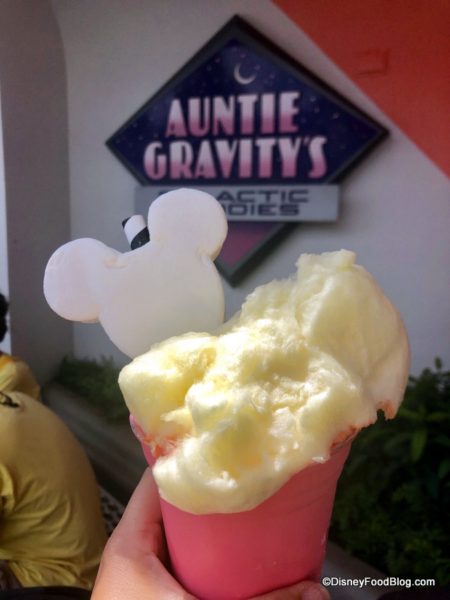 The cotton candy is accompanied by a soft white Mickey-shaped marshmallow! We’ve seen a couple incarnations of this marshmallow at Auntie’s over the past several months, and we love it!