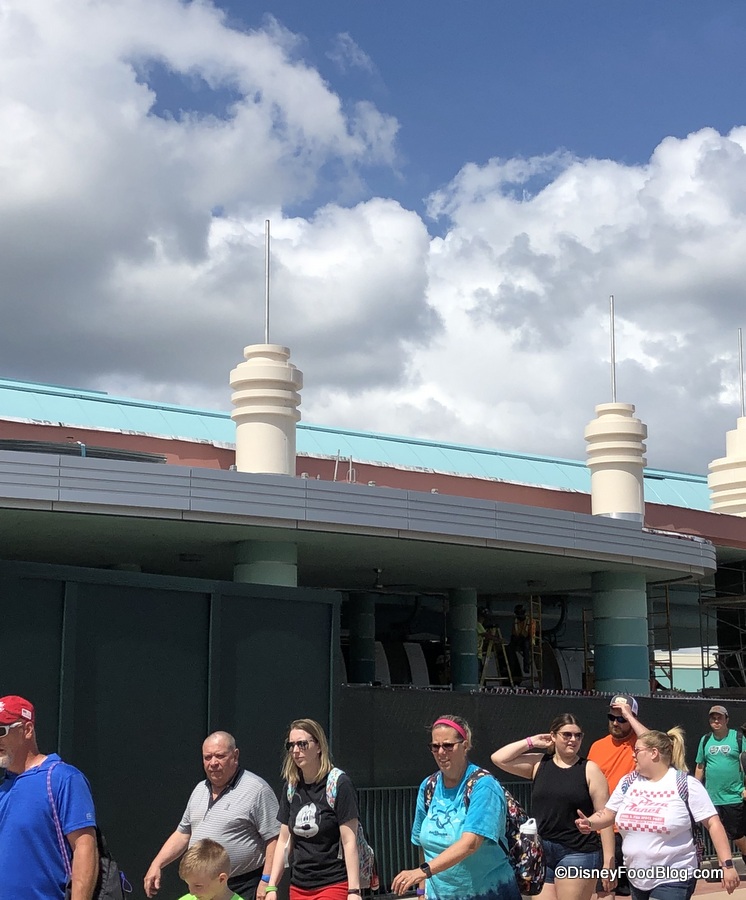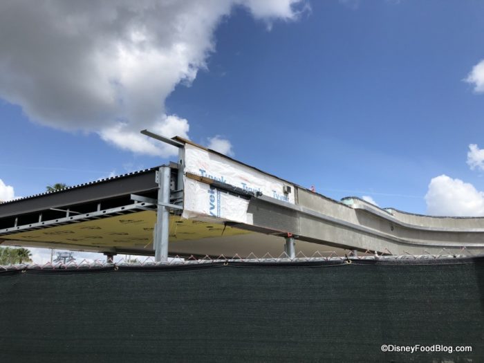 Entrance construction continues with three ongoing projects. The large structure near the entrance (which cast members have said includes an extended bag check in anticipation of large crowds later this year — gee, I wonder why…) is receiving its facade and a paint job.