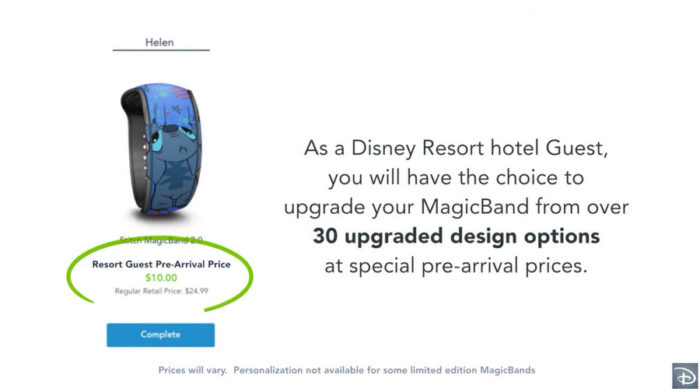 Disney Resort hotel guests and new and renewing Annual Passholders will be presented with the option to upgrade from the typical complimentary solid-color MagicBand to one of more than 30 new MagicBand options. The pre-arrival purchase price will be $14.99 off the retail price you would find in the parks.
