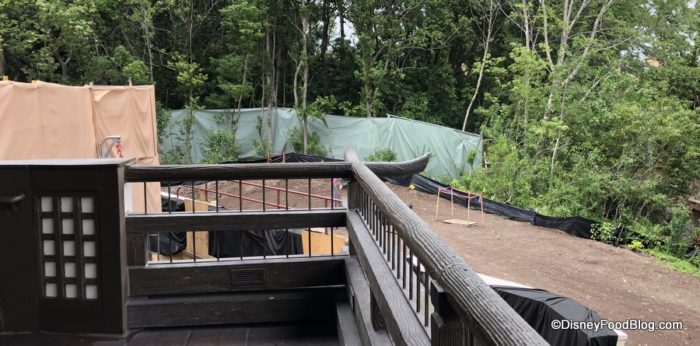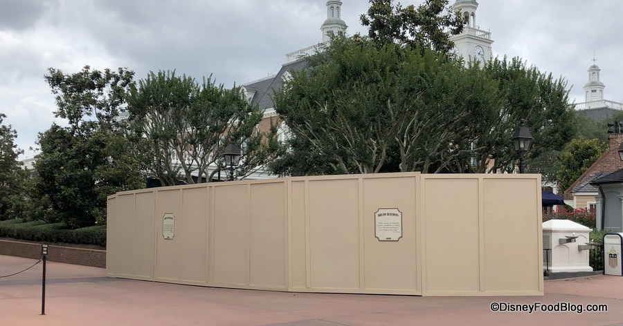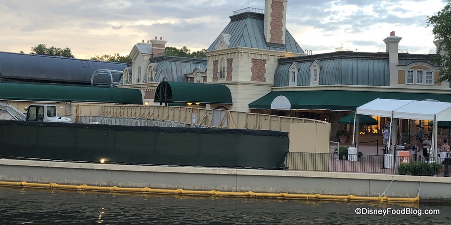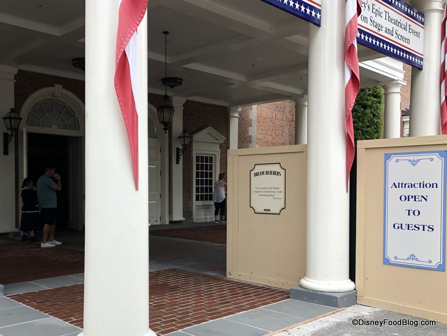 Over at the American Adventure pavilion, construction walls and fences are up from the seating area to the DVC booth.