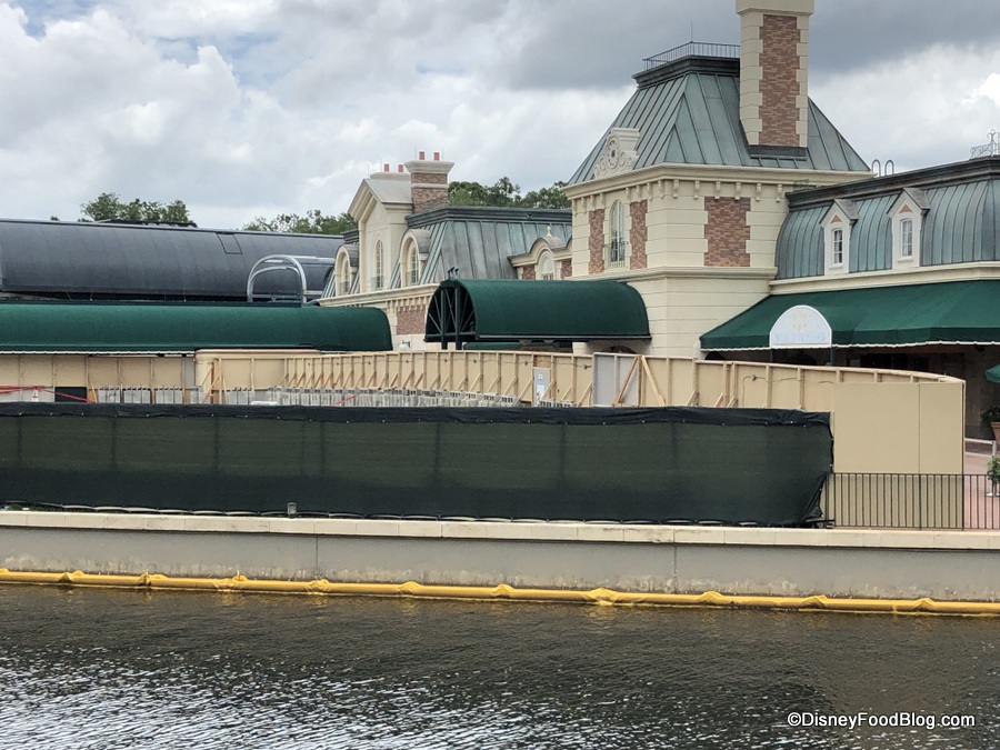 Construction on the new Ratatouille ride at the France pavilion continues. Scaffolding is visible over the roofline from various angles.
