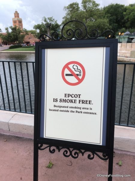 In the former smoking area between Norway and China, guests will now find this no smoking sign. It indicates that the designated smoking area is outside the Park entrance. See more here!