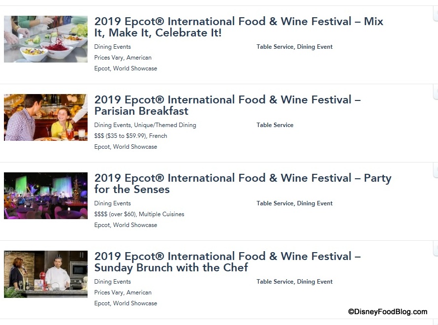 Please note: as with the previous listings, these entries do not link to actual reservations pages as of press time. They link back to the general Food and Wine Festival page which provides no specific information or booking opportunities for these new listings. So, at this time, we can’t call these events confirmed.