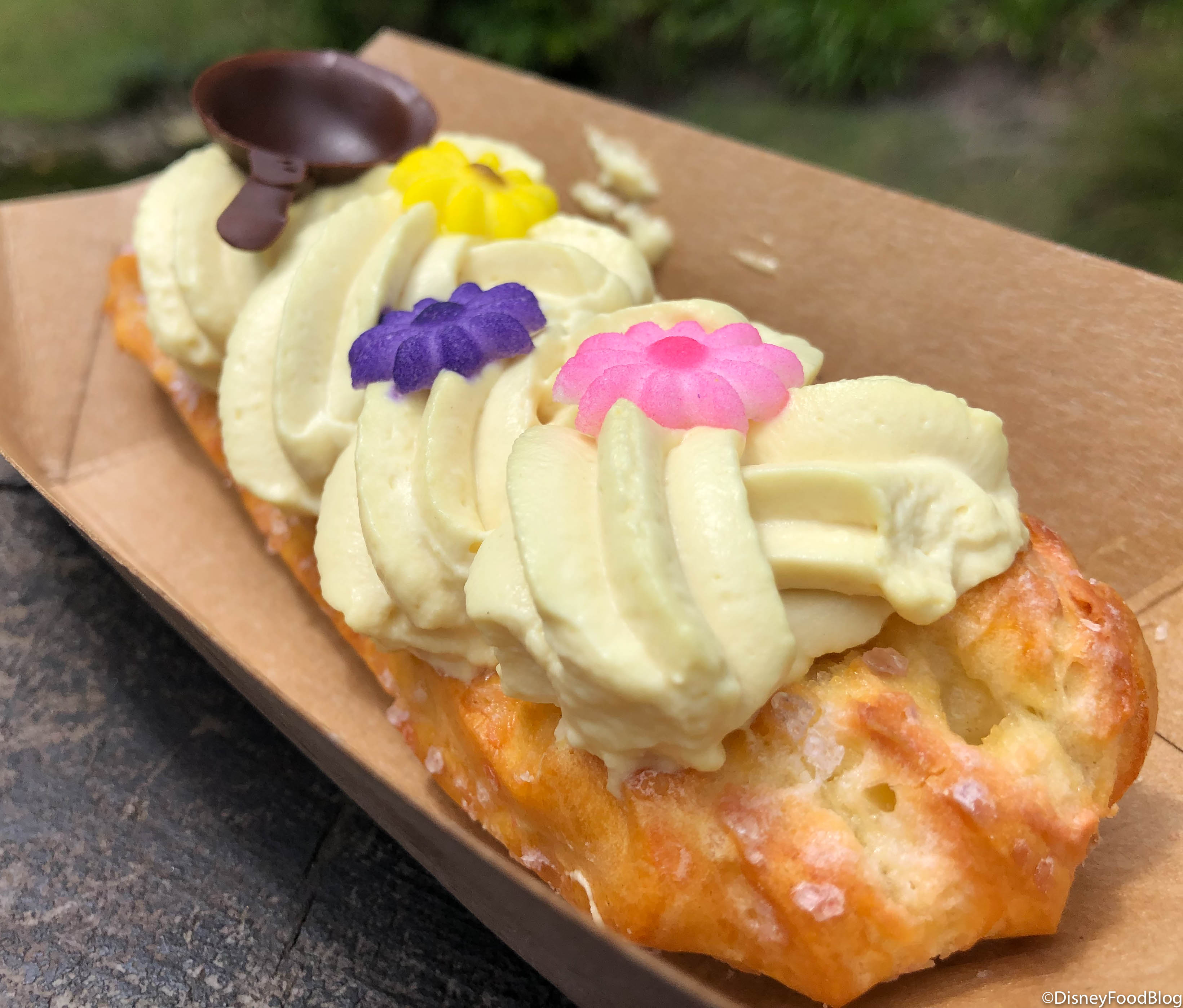 This totally Instagrammable treat is topped with white chocolate whipped cream Punzie hair, sugar flowers, purple craquelin, and a chocolate frying pan! The white chocolate whipped cream tasted more like standard whipped cream to us though.