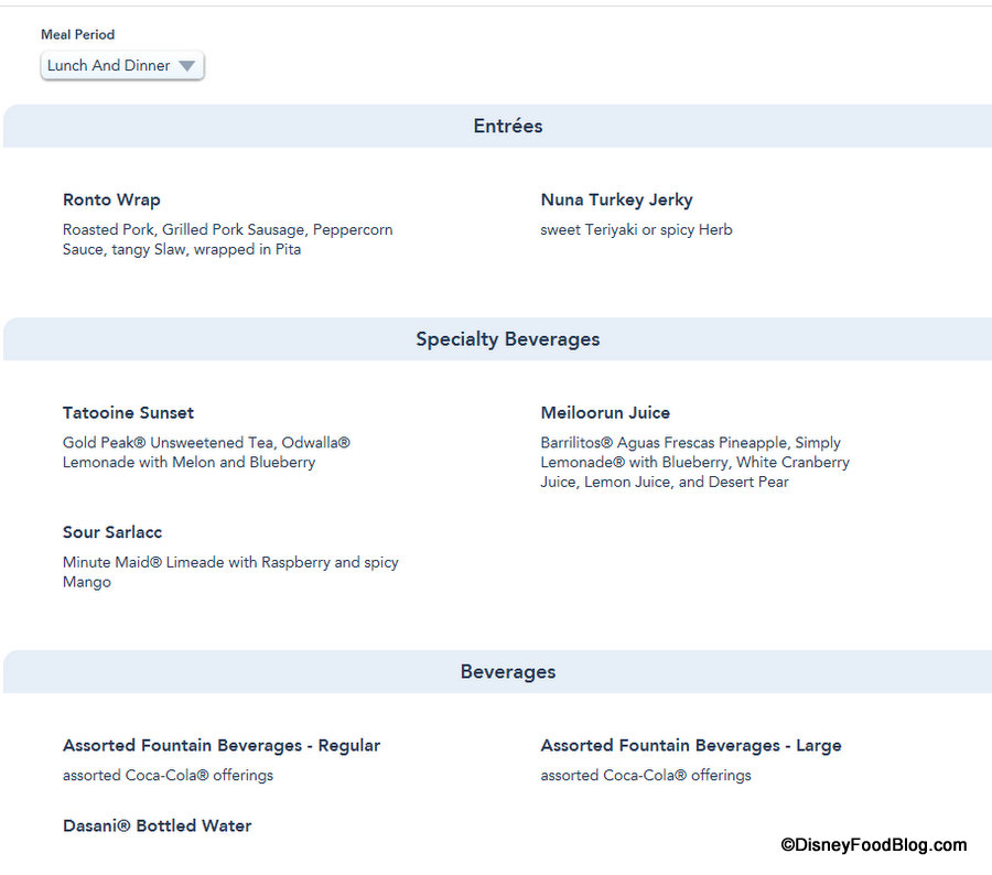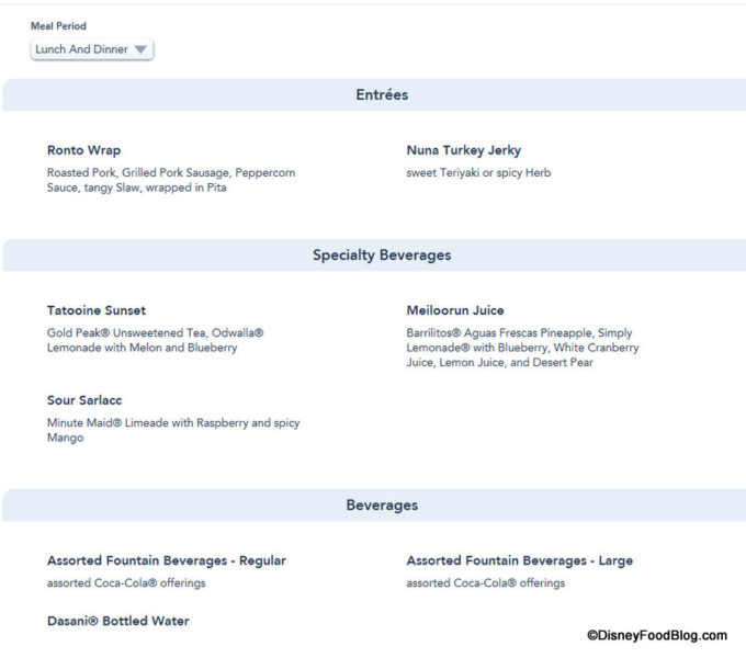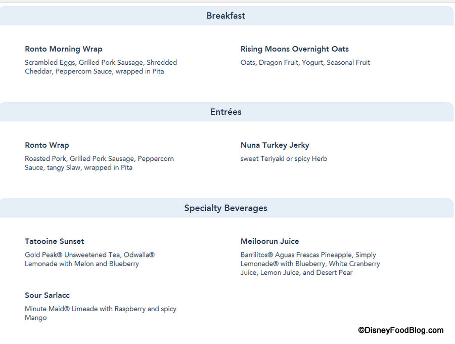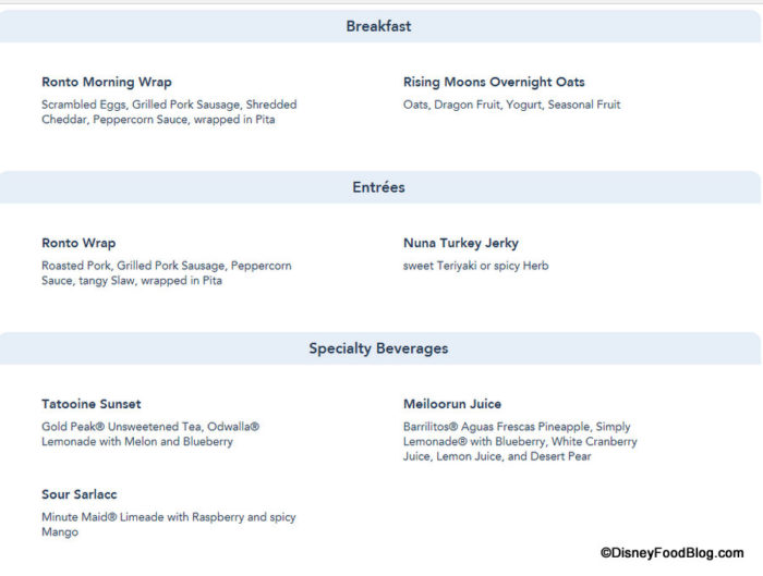 The other items on the menu will also be served during Lunch and Dinner: the previously announced Ronto Wrap and Nuna Turkey Jerky, along with three previously announced drinks — Tatooine Sunset, Meiloorun Juice, and Sour Sarlacc.