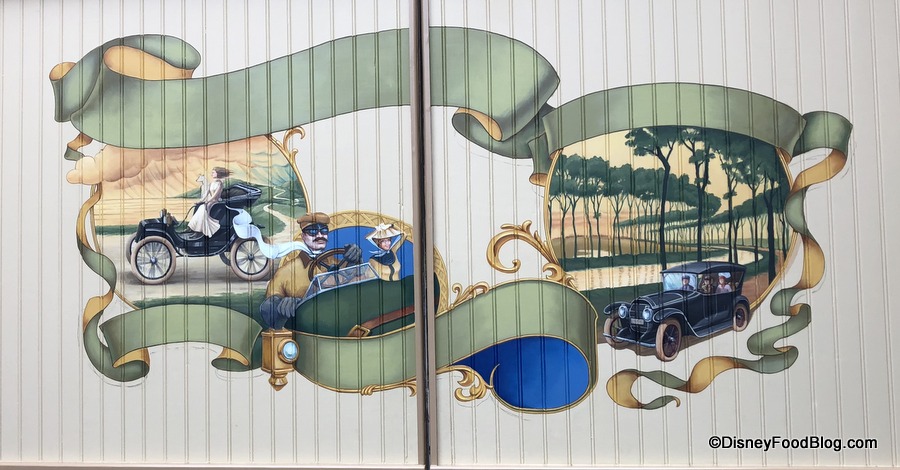 The mural features vehicles from the early 1900s (and some stylish drivers and passengers, too!).