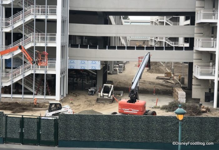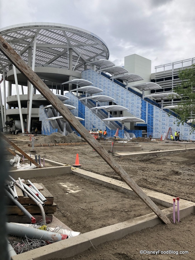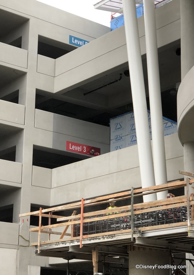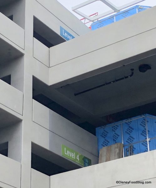 There’s some visible progress on the Pixar Pals Parking Structure. Some wall board is going up on the escalators.
