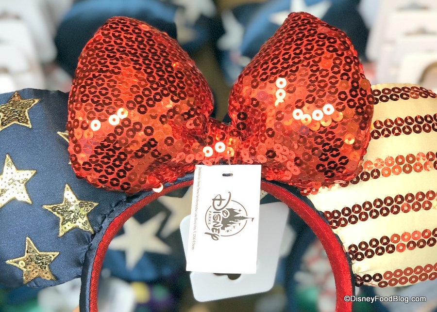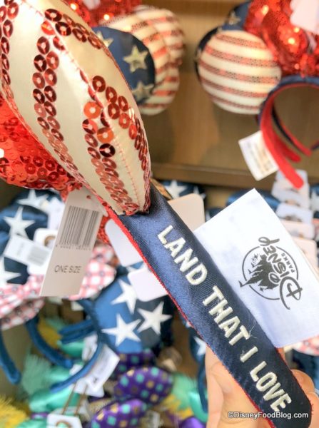 Land That I Love American flag Minnie ears are available in various locations in both Parks and Downtown Disney. We found these at World of Disney in Downtown Disney.