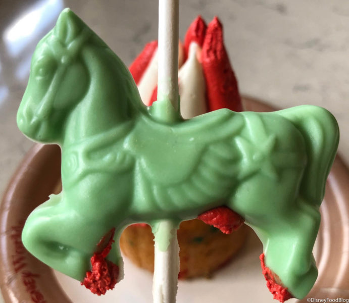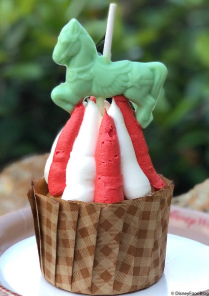 This cupcake immediately draws the eye with its carnival-striped buttercream and charming white chocolate carousel horse on the top.