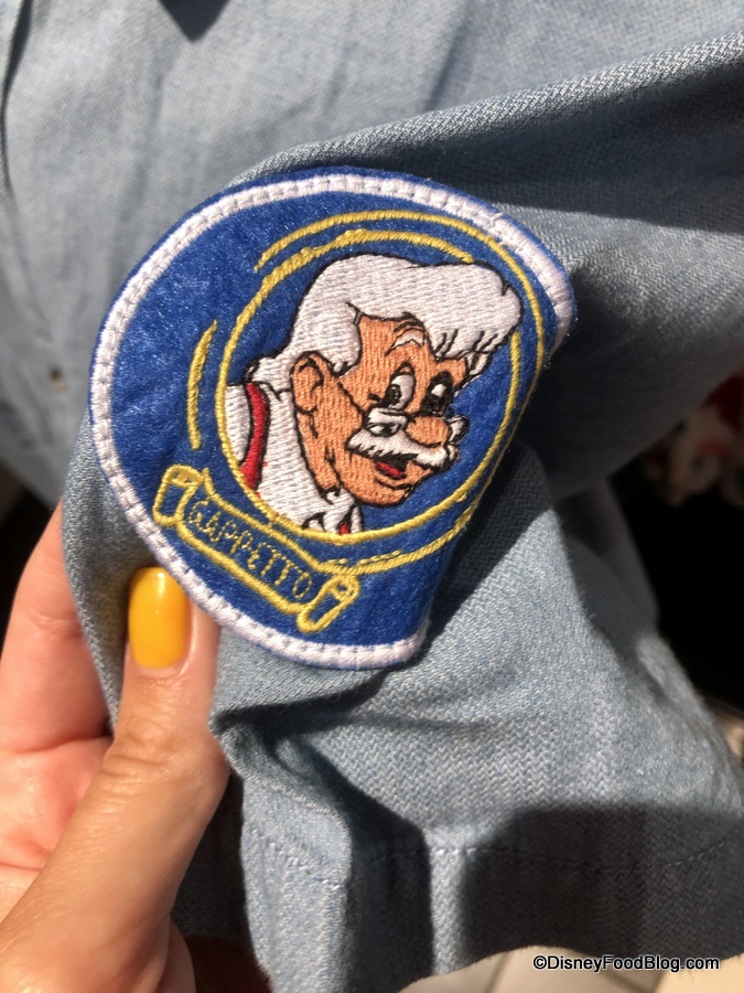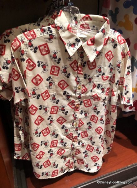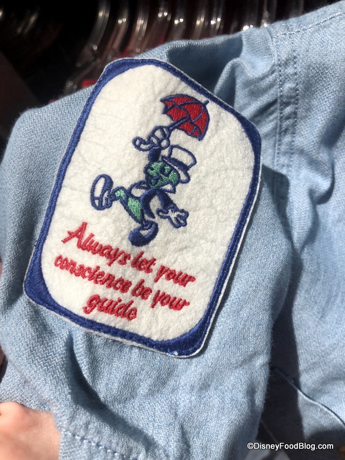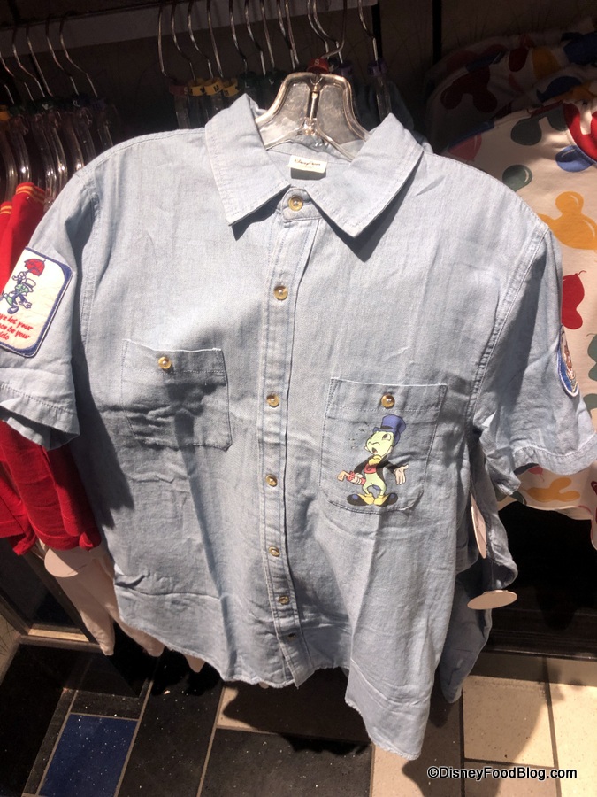 This short-sleeve button down features Jiminy Cricket both on the front pocket and on a patch on the sleeve.