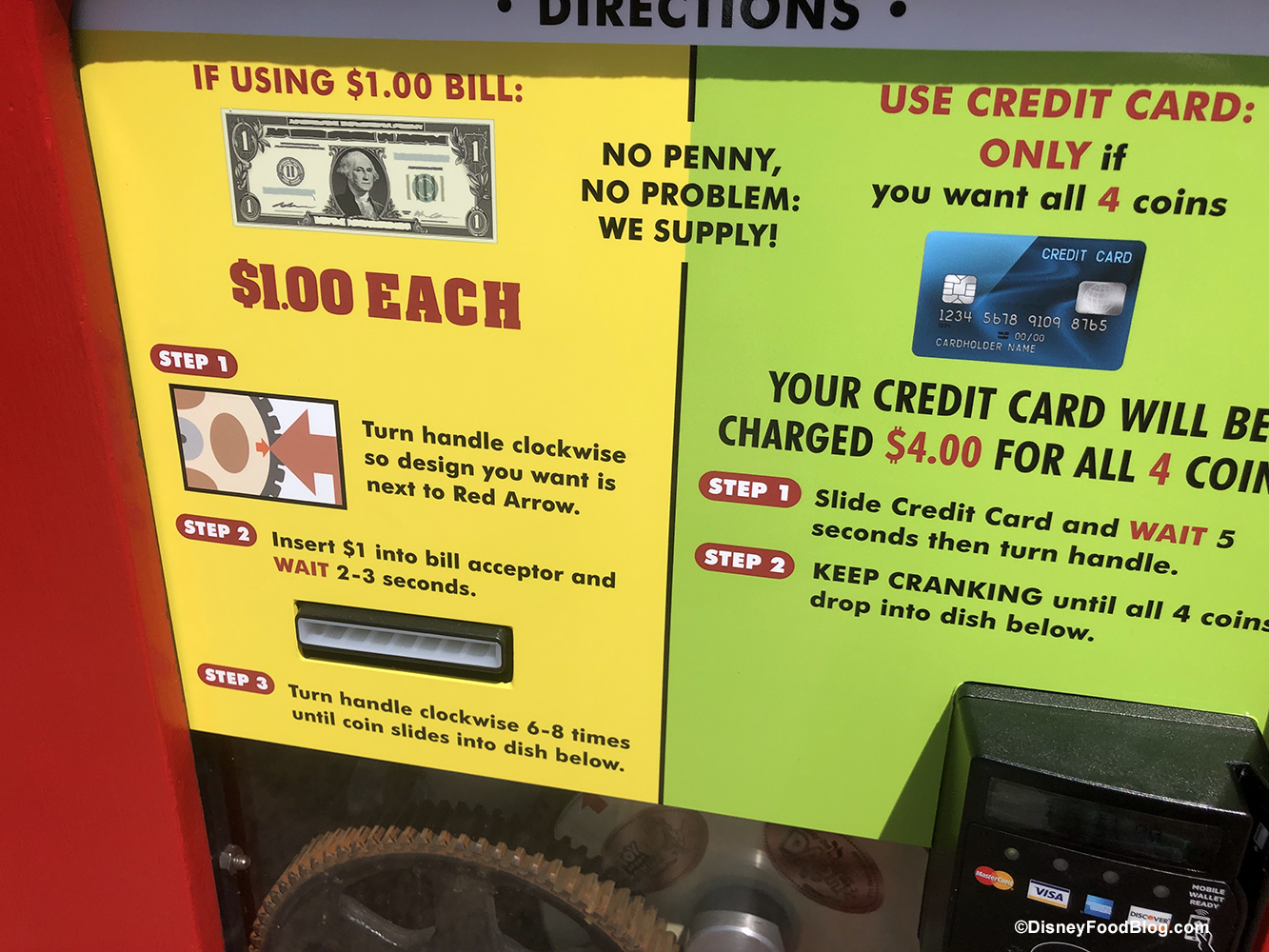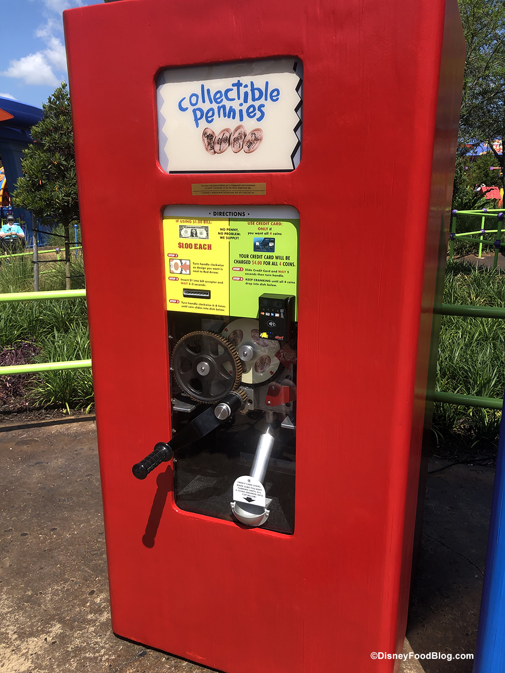 The Pressed Pennies machine features four designs and — get this! — the machine supplies the pennies. 😉 Cost for one penny is a dollar, and the machine accepts a credit card if you want to use it to pay $4 for all four pennies.