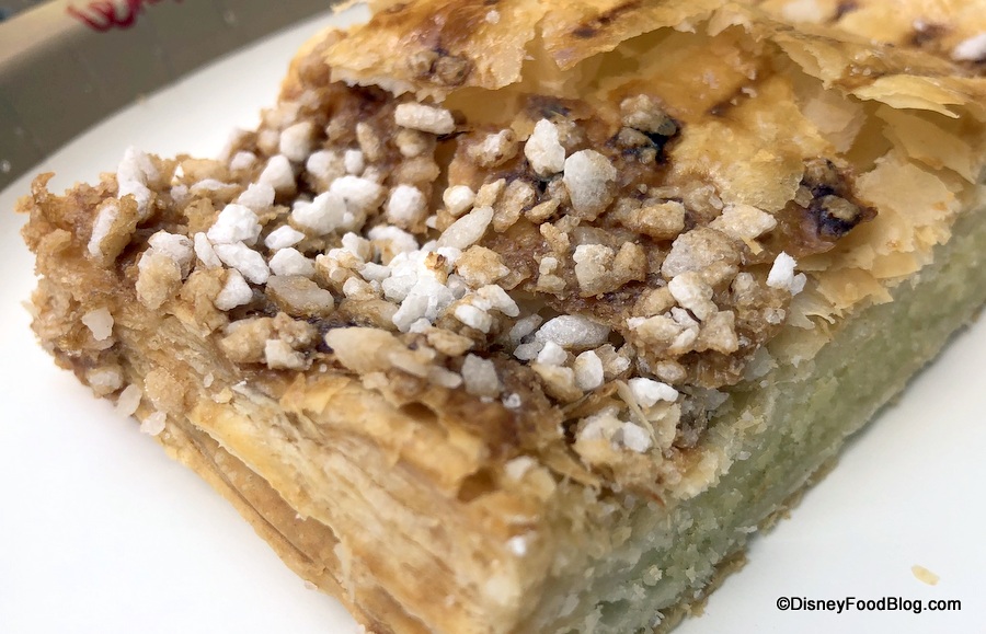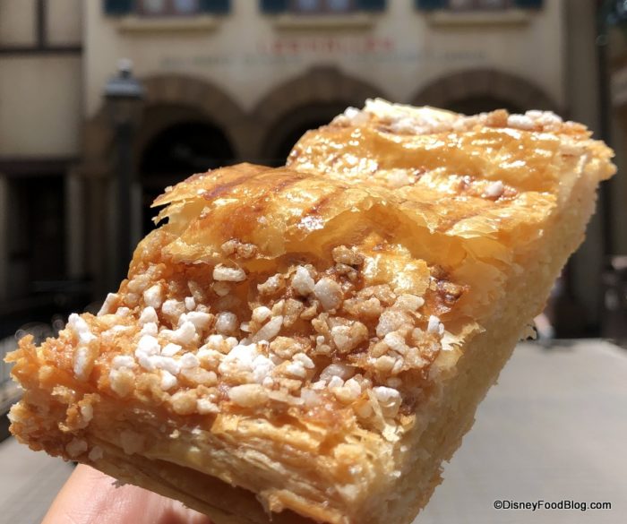As it turns out, though… my beloved Frangipane has been changed. The menu will still tell you that the Frangipane ($4.50 or a Disney Dining Plan snack credit) is an “almond filling between puff pastry.”