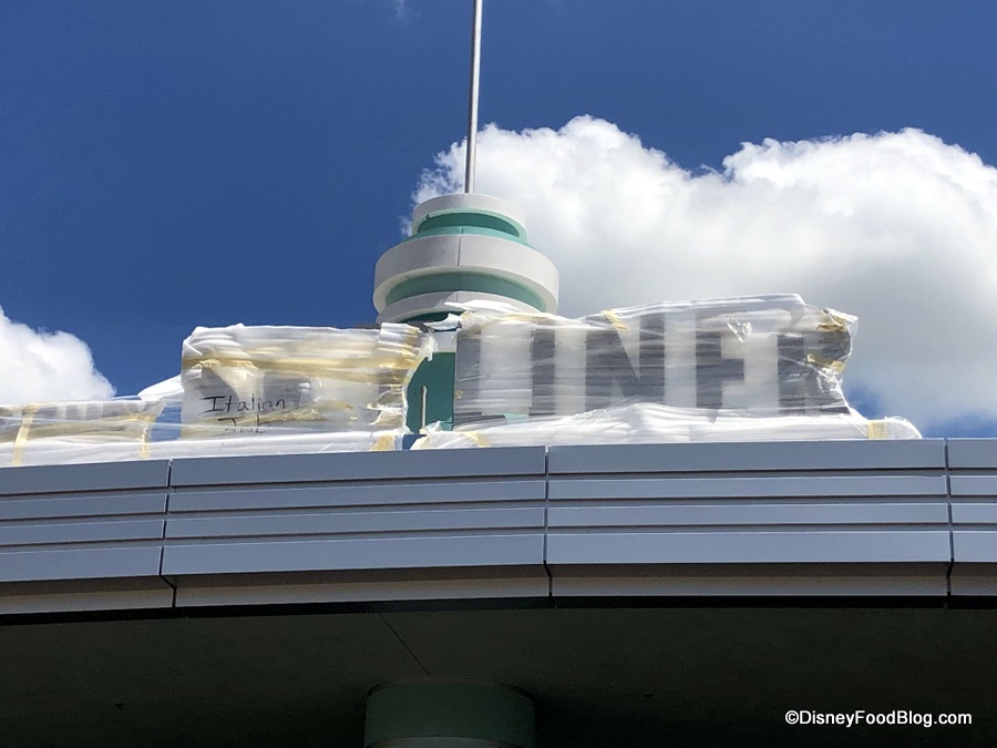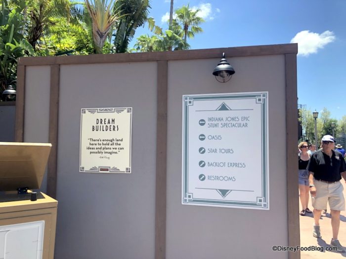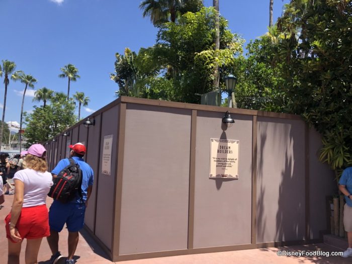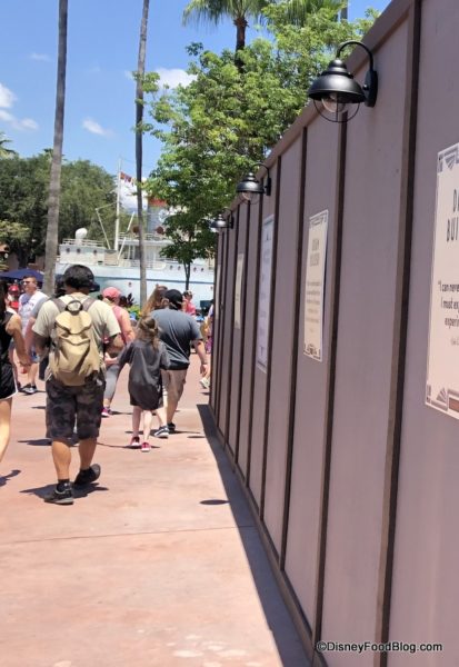 Over in Echo Lake, construction walls are up along the pathway to Oasis Canteen from the Backlot Express area.