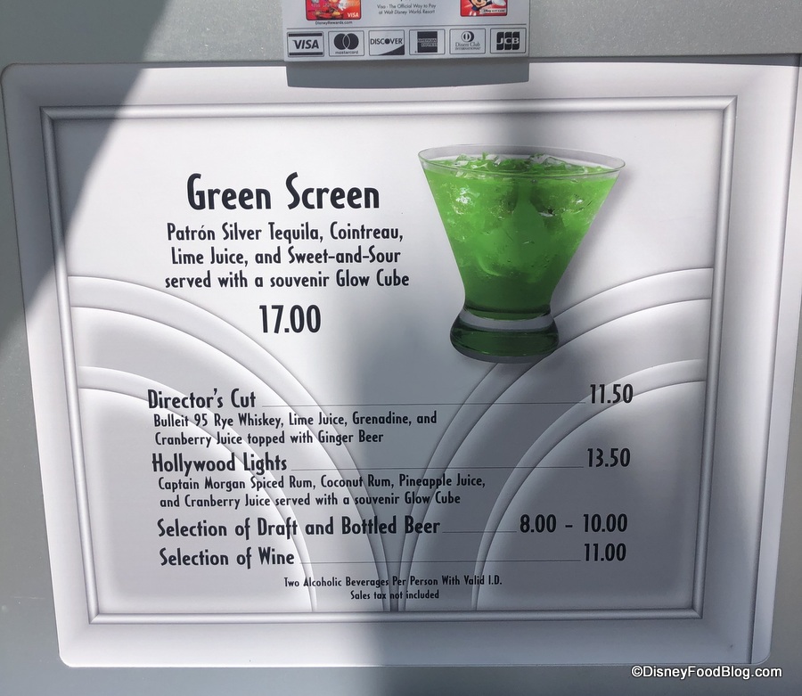 The pop-up bar on Hollywood Boulevard near the popcorn cart on the way toward Animation Courtyard is offering up two returning cocktails — Green Screen and Hollywood Lights — and one cocktail combination we’ve seen variations of, but which has been given a new-to-us name — Director’s Cut.