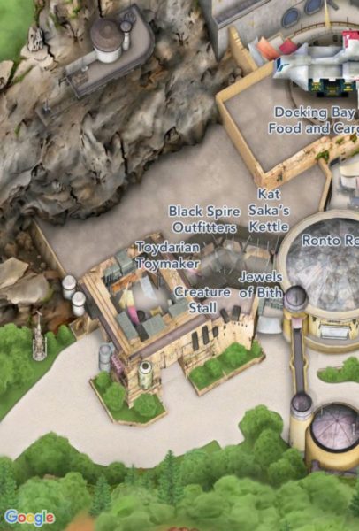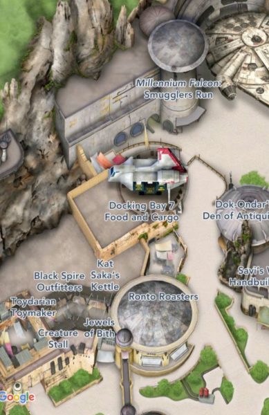 Zoom in closer and you can see the orientation of spots like Docking Bay 7 Food and Cargo, Ronto Roasters, and the Toydarian Toymaker.