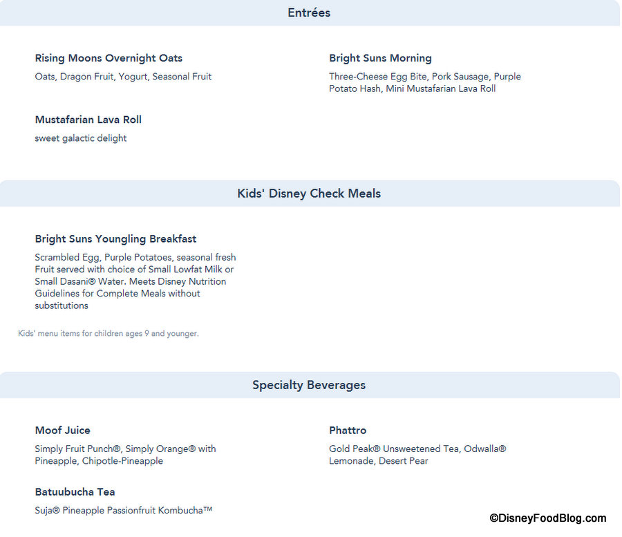 will feature Rising Moons Overnight Oats, the Bright Suns Morning meal for adults and Younglings, and the Mustafarian Lava Roll, along with Specialty Beverages.