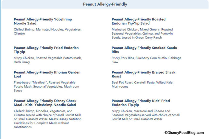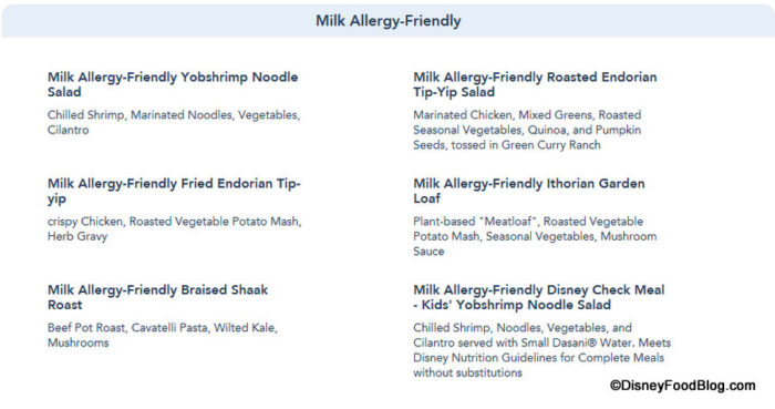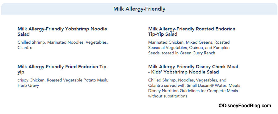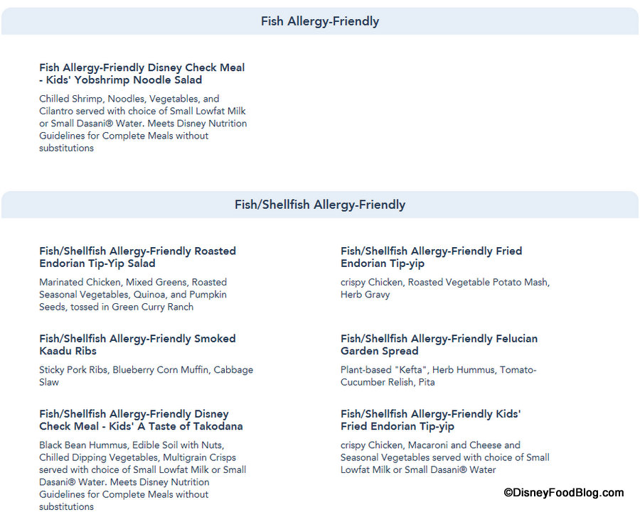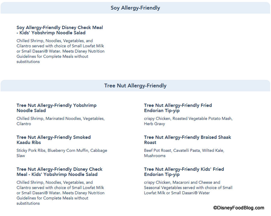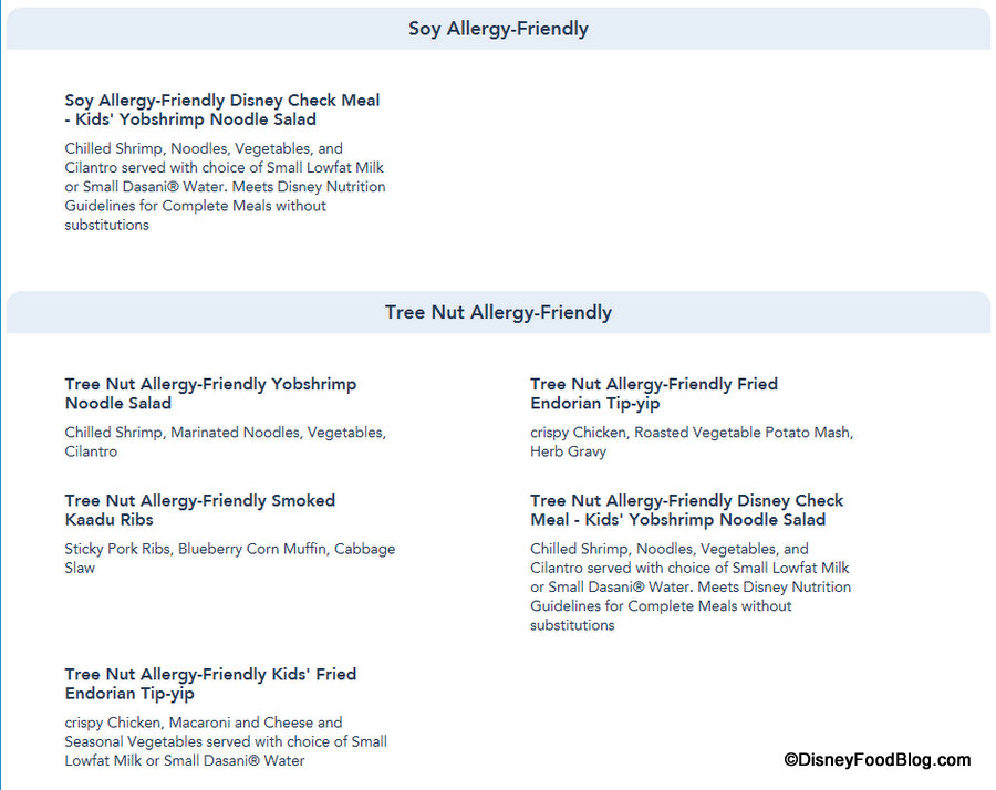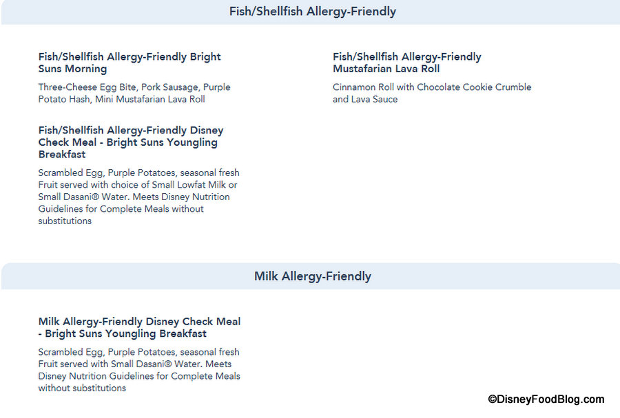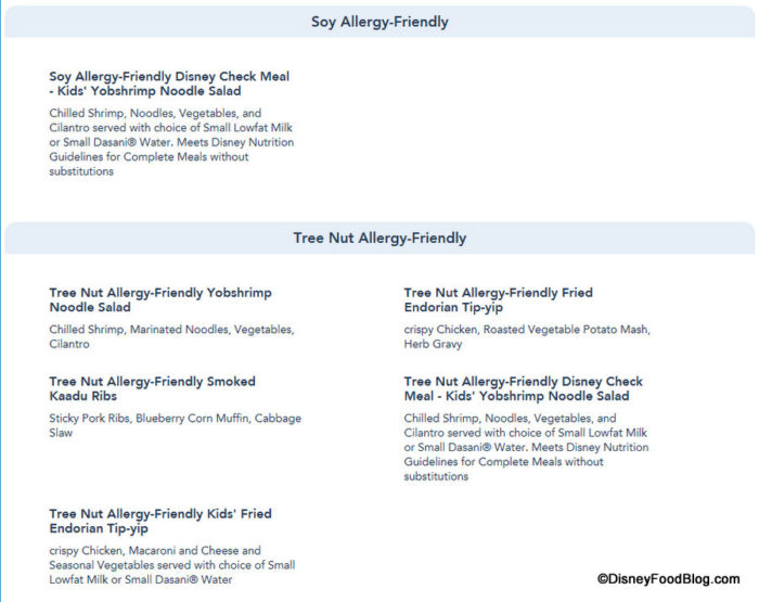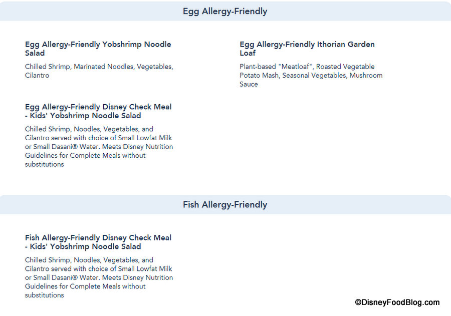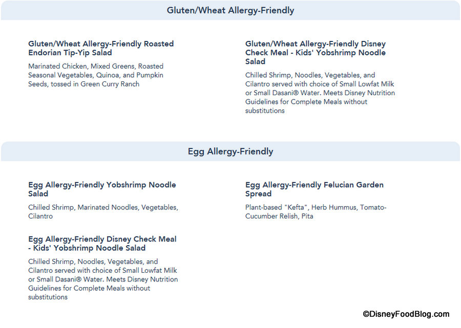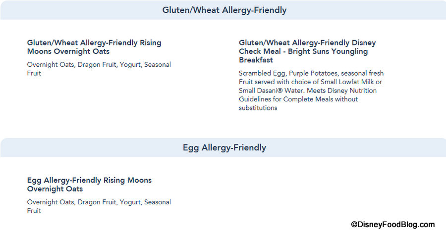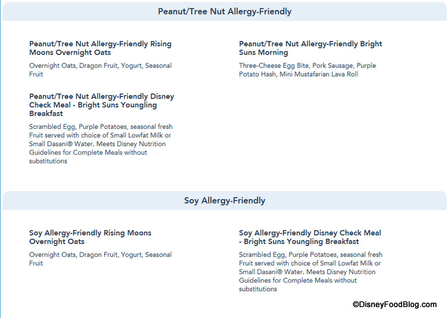 And the Allergy-Friendly sections are updated to reflect those items accordingly, as again Allergy-Friendly options can now be viewed for Gluten/Wheat, Egg, Fish, Fish/Shellfish, Milk, Peanut, Tree Nut (listed separately for Dinner) and Soy allergies for Dinner.
