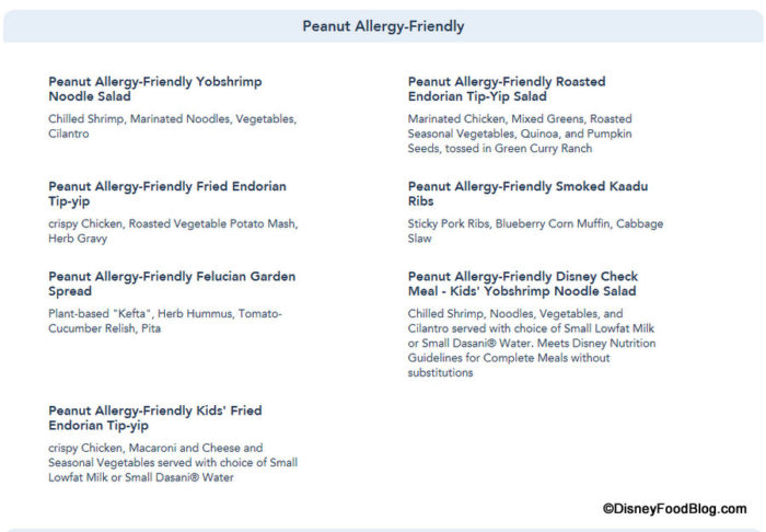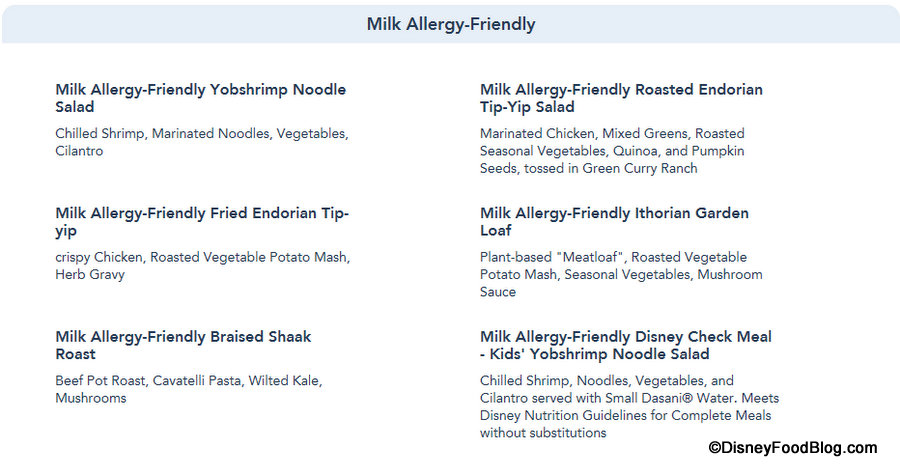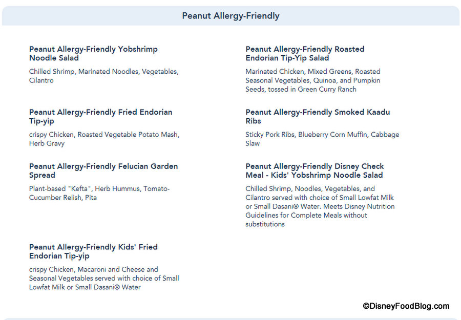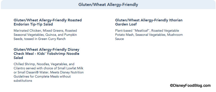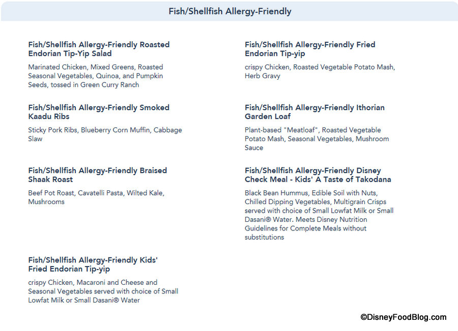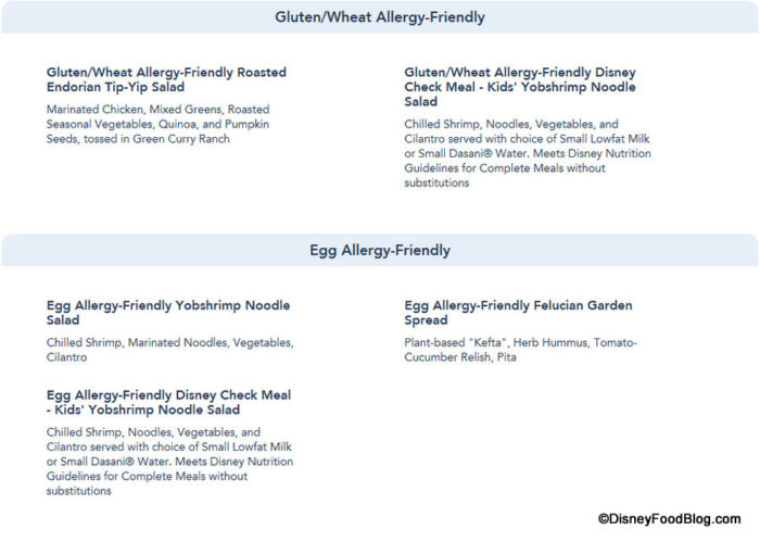 While the full menu for Docking Bay 7 Food and Cargo has been available for some time now, guests who are traveling to Batuu who have (or are traveling with someone who has) food allergies will be interested to know that Allergy-Friendly menu items are now designated on the Docking Bay 7 Food and Cargo menu posted on the Disneyland website.