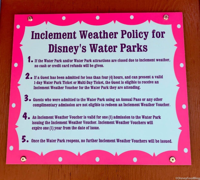 Also, make sure you check out Disney’s inclement weather policy for the water parks!