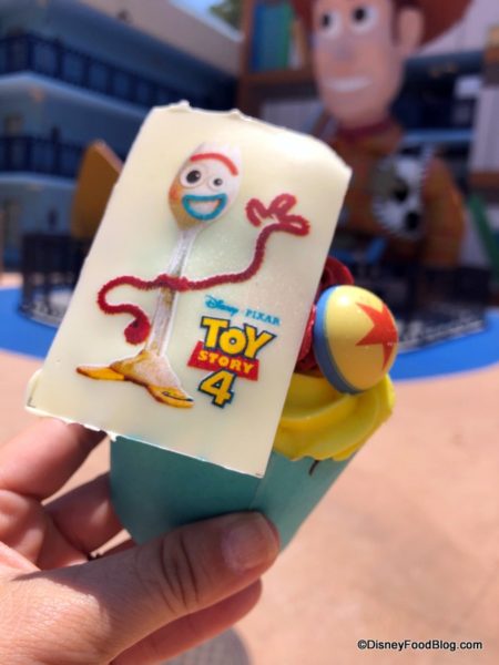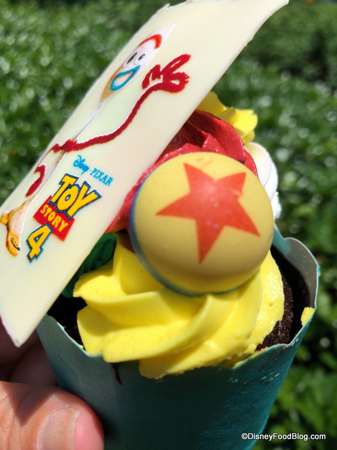 Taking center stage on the cupcake is a white chocolate Forky piece! (You may want to eat this one inside, because Forky melts quickly in the sun!)