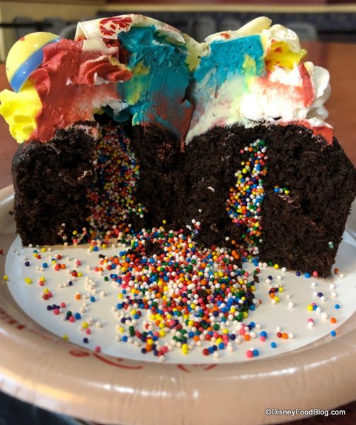 And Forky even has a surprise for you… Because A TON of rainbow nonpareil sprinkles come tumbling out once you cut into the cupcake!