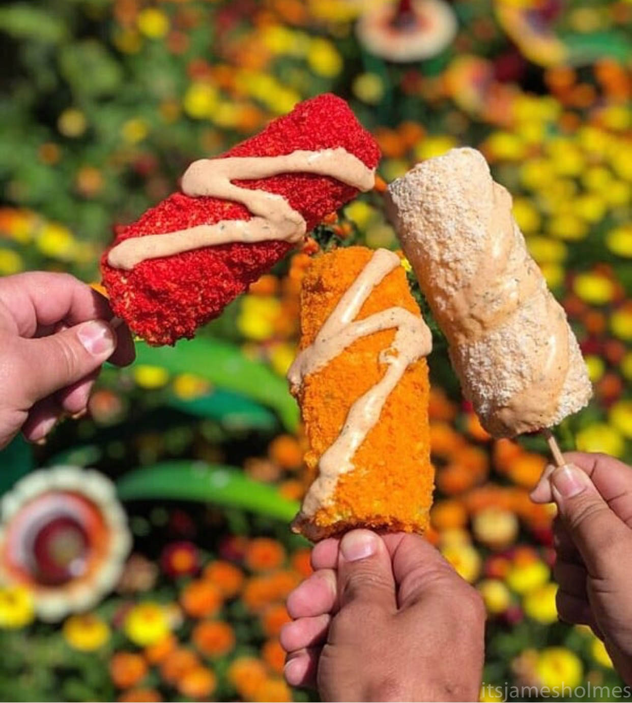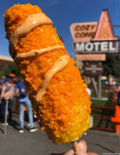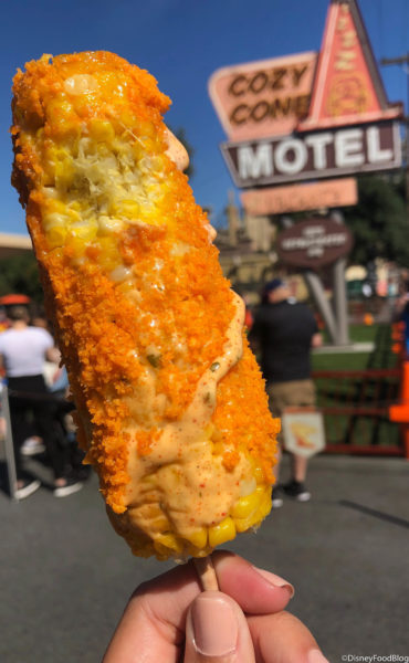 The Disney California Adventure quick service location just released three flavors of Elote Cozy Corn! Each one of these is buttered corn on the cob brushed with spicy lime mayo. Next, the elote is rolled in whichever flavor you choose from Cojita, Cheese Puffs, and Spicy Cheese Puffs.