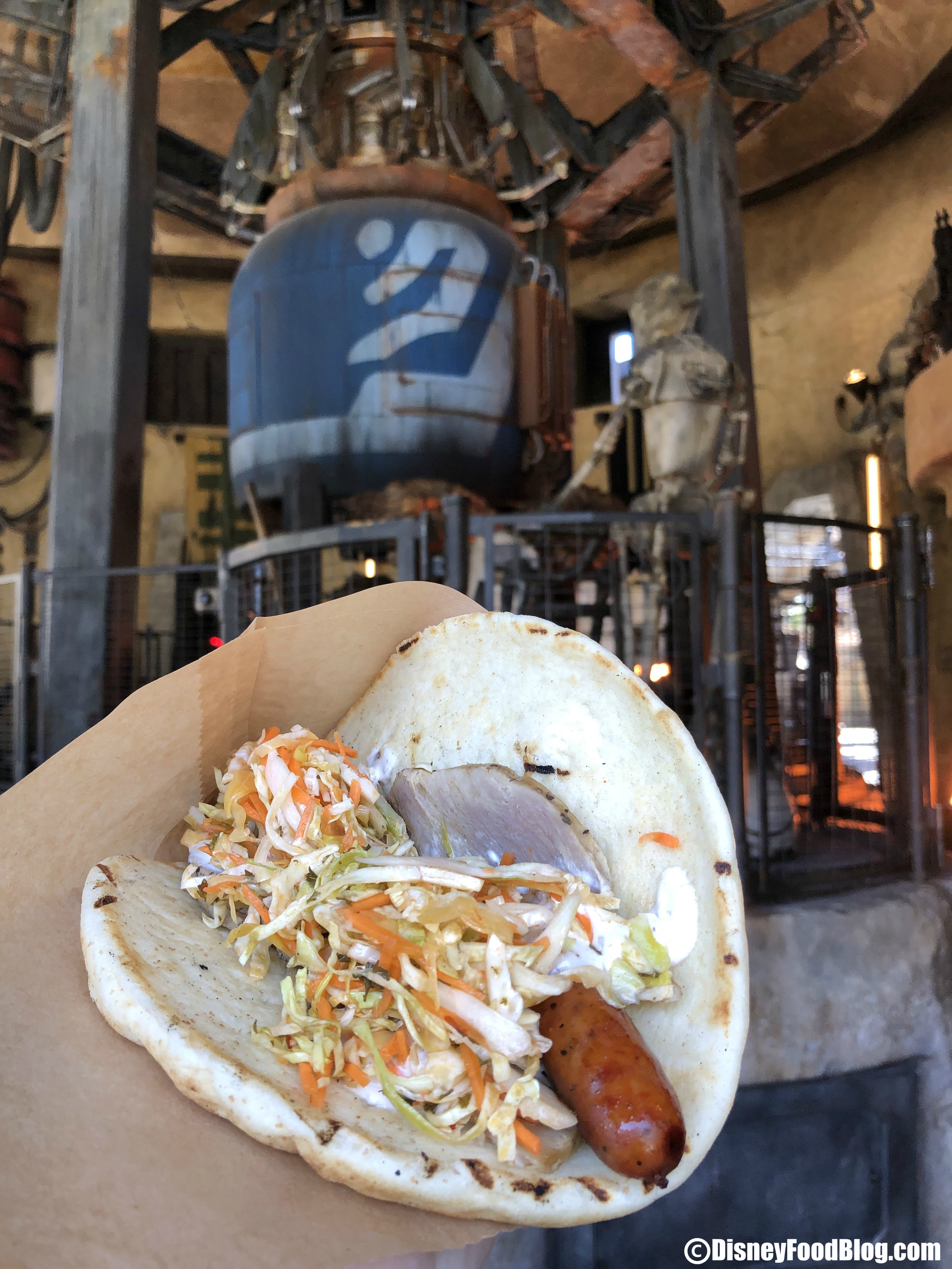How about a Ronto Wrap ($12.99)? This surprisingly is one of the better food items in ALL of Galaxy’s Edge. The wrap is filled with roasted pork, grilled pork sausage, peppercorn sauce, and a tangy slaw. Like the breakfast wrap, it’s all wrapped up in a pita.