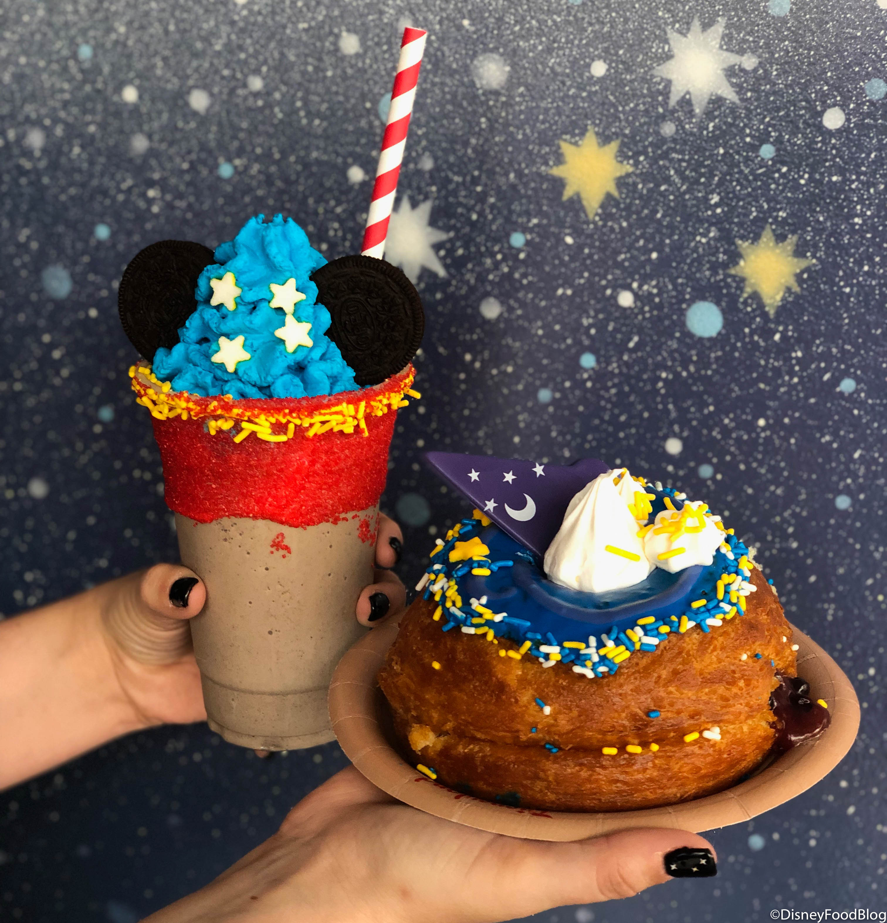 The Sorcerer Mickey Shake is a cookies and cream shake topped with blue whipped cream and chocolate cream-filled cookie ears. The shake tastes just like the Cookies and Cream Get Your Ears On Shake that just ended its run (so, basically YUM!)! Check out our full review here.