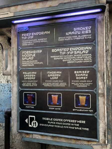 is Star Wars: Galaxy’s Edge’s quick service restaurant. Like the rest of this new land — officially open TODAY at Disneyland Park!! — Docking Bay is highly themed. The restaurant is recognizable for the multi-transport shuttle on its roof, so if you’re looking for some galactic eats, head toward the shuttle!