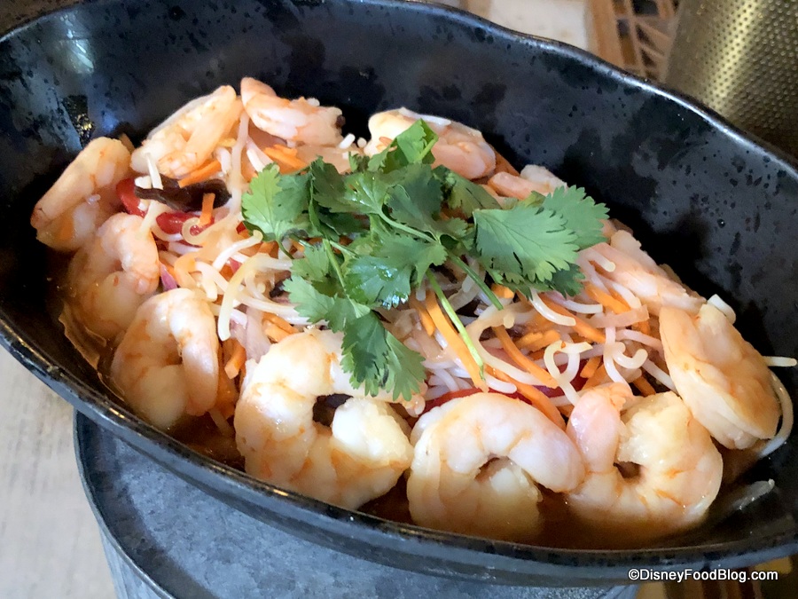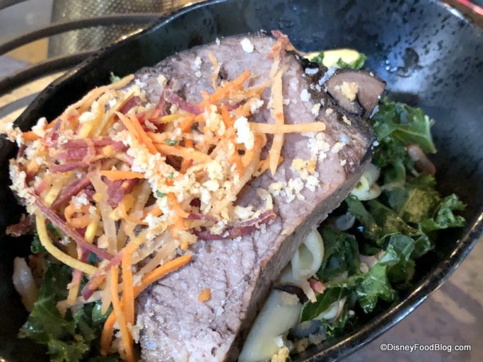 The Yobshrimp Noodle Salad was…not our favorite. This chilled dish consists of shrimp, marinated noodles, vegetables, and cilantro. The kids’ version of this dish specifies a sweet orange dressing, so we think that’s the dressing on the adult version, too. We found the overall flavor to be a bit one-note: pickled. Something about it, again, was just too sour for us. But if you enjoy pickled foods, you might like this! It’s certainly a light and creative option for theme park dining — no doubt about that — but we just weren’t fans.
