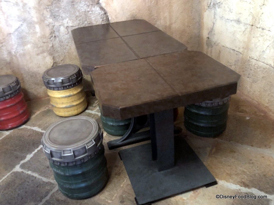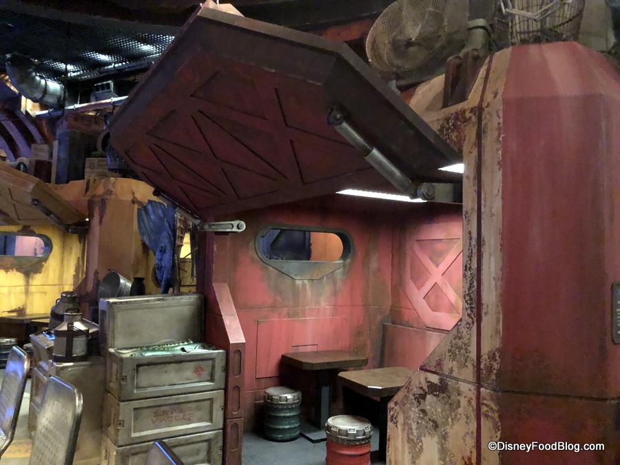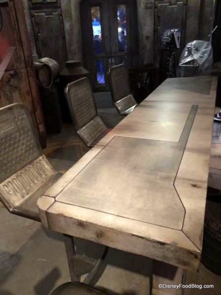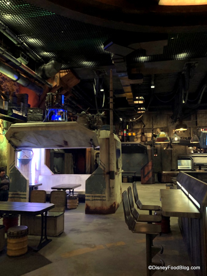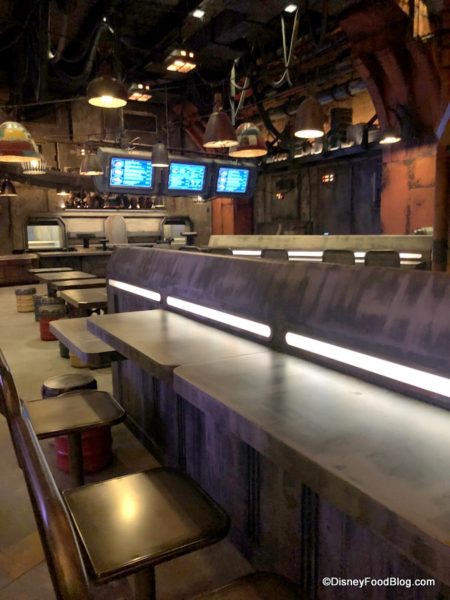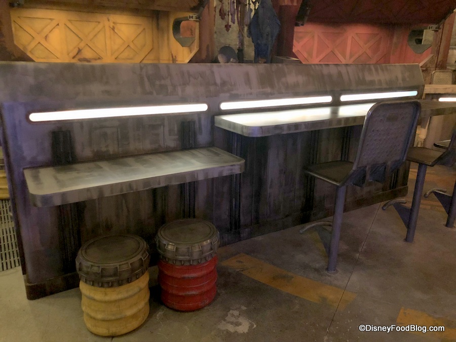 The seating area at Docking Bay is to the left of the entrance, and the decor here is essentially the same as we see everywhere in Galaxy’s Edge: industrial on top of industrial — but with subtle pops of color, including colorful uplights.
