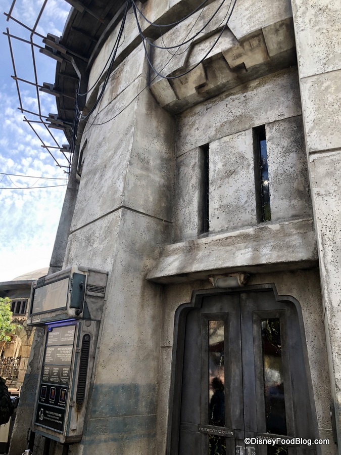 Another recognizable feature of the restaurant’s roofline is a large circular dome, so when you’re hunting for Docking Bay 7, be sure to look for these characteristics. Docking Bay, as with most other landmarks in Black Spire Outpost, does not have a sign in English labeling the entrance to the restaurant. You’ll need to scan the symbols above restaurant and shop entrances to confirm that you’ve found the right place (you’ll need your Datapad for that — click here to learn more!), but with Docking Bay 7, if you see a transport shuttle on the roof, you’ve arrived. 😉