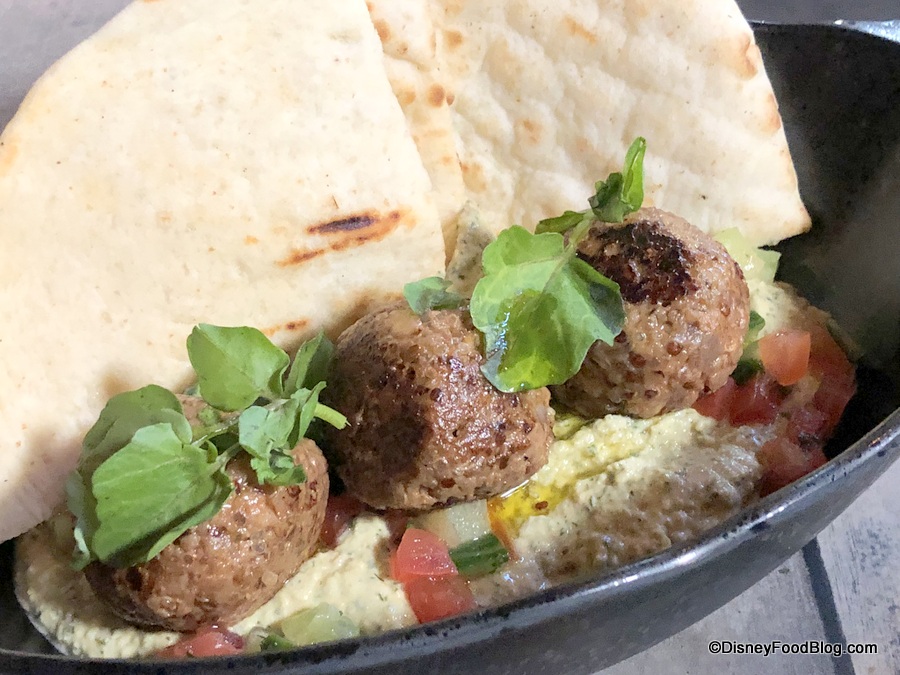 Docking Bay also offers a few items that are only lunch or only dinner. The Lunch-only option is the Felucian Garden Spread. This vegan dish consists of plant-based ‘kefta’, herb hummus, tomato-cucumber relish, and pita. The ‘kefta’ are Impossible brand meatballs, so we know a lot of you will be happy about those! And they were very, very good.