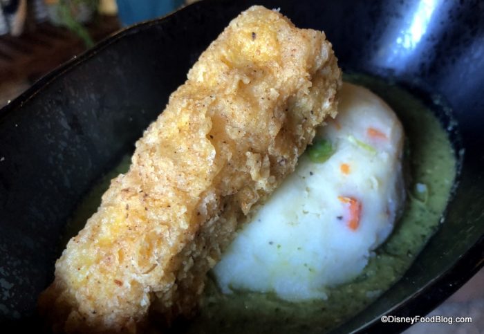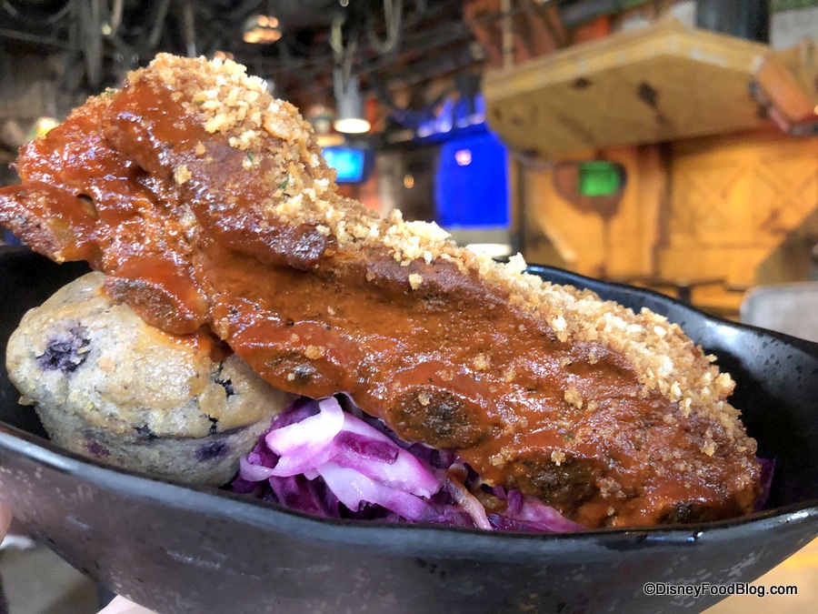 Fried Endorian Tip-Yip is a dish that will be familiar in some ways — because it’s fried chicken! But of course, it’s had an other-worldly twist in that it’s a block. Seriously: it’s cut into a rectangular cube with straight edges and no sense of what that meat should look like organically. Rather than the typical Disney Parks chicken nugget breading, the Tip-Yip has a panko-style breading, giving it a different texture than you might expect from a chicken tender, essentially, in the Parks. And unfortunately, aside from the breading, the chicken didn’t have much flavor. Even more unfortunately: it was dry. Way overcooked. Maybe it’s the Tip-Yip way, but meh.