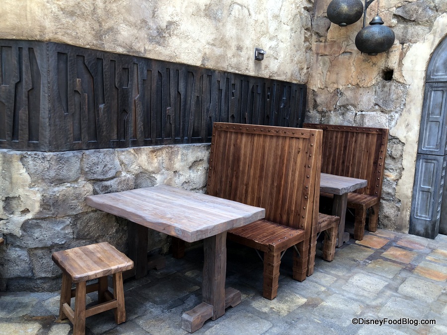 The word you’re searching for is “wow”. The Stone outcroppings in the background juxtaposed with the tan tones of the restaurant are something special. This is easily one of the loveliest spots we found in Galaxy’s Edge, and we can see it becoming a go-to place to escape. Not gonna lie: if they had alcohol at Docking Bay, this would be a terrific beer garden (or cocktail garden… that’s a thing, right?).