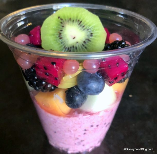 The oats are pink in color due to the dragon fruit juice. And the ratio of fruit to oats is a little heavier on the fruit. Seasonal fruit on our visit consisted of blueberries, melon, mango, and kiwi. And because it’s Disney, there are some strawberry popping pearls on there, too.