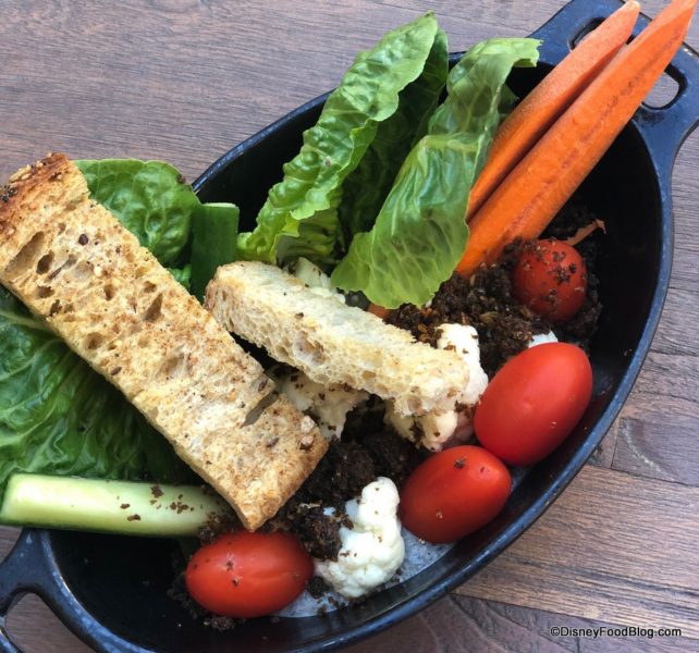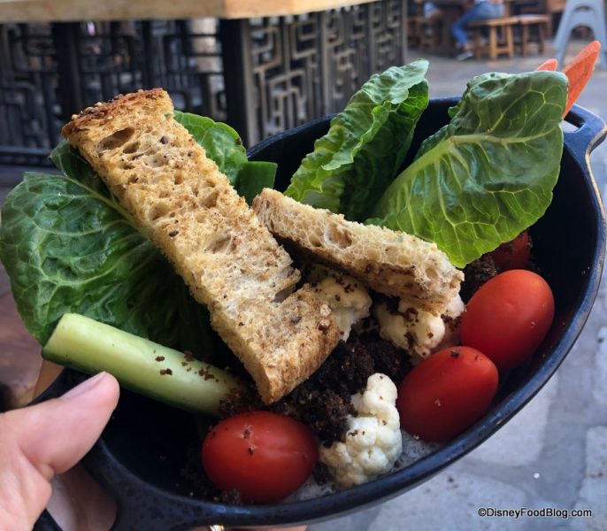 The third kids’ menu item is A Taste of Takodana, which serves up black bean hummus, edible soil, and nuts along with veggies (ours had grape tomatoes, lettuce leaves, and cauliflower when we ordered it) and multigrain crisps for dipping.