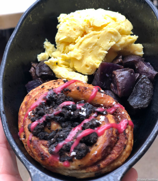 Bright Suns Morning is the Batuu equivalent to a breakfast platter! It’s got eggs, purple potato hash, sausage (the same as Ronto Roasters), and a miniature Mustafarian Roll.