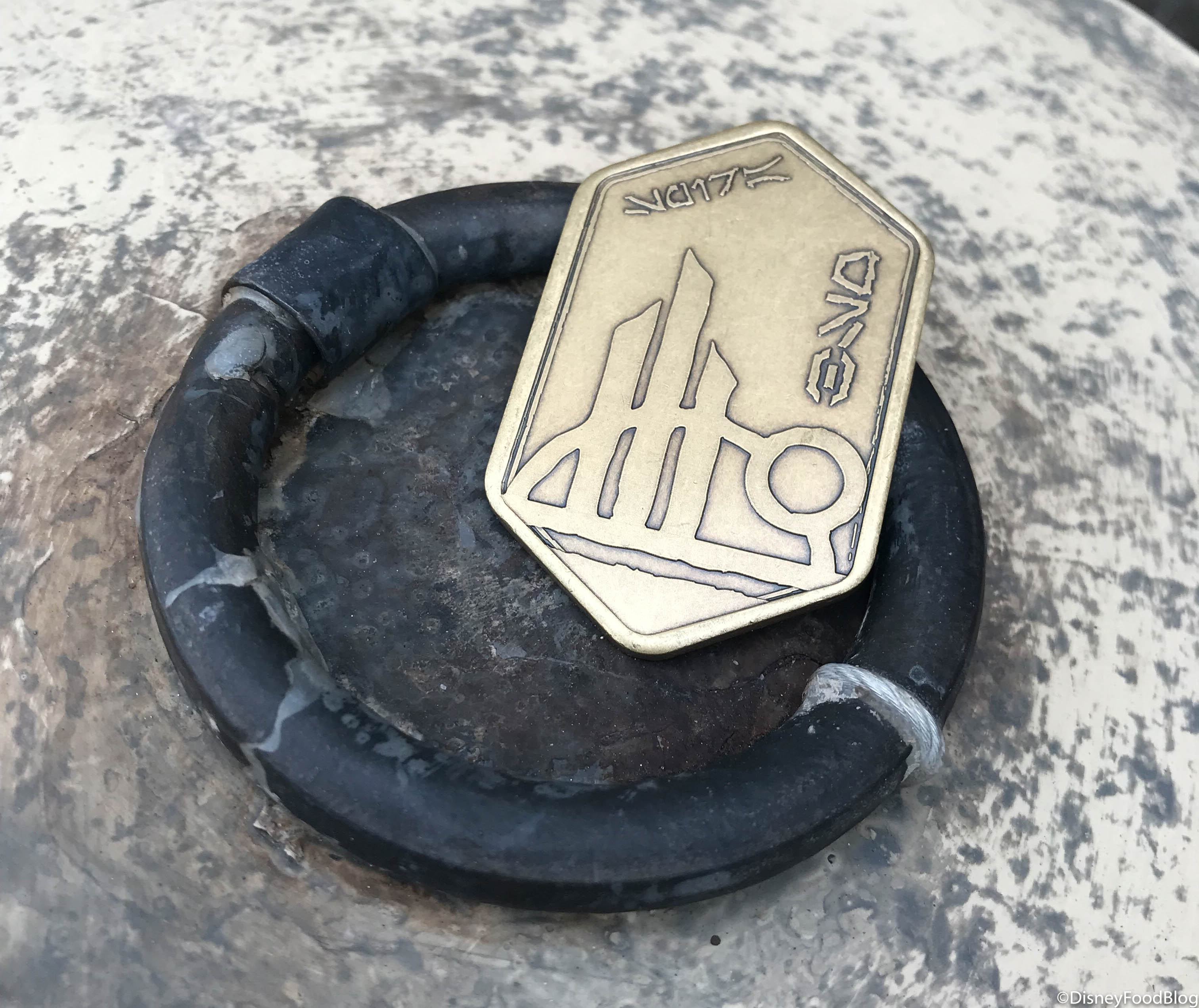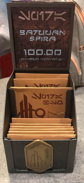 Galaxy’s Edge gift cards are a metal chip etched with the symbol of Black Spire Outpost! It is made to look like Batuuan Spira, which is the ancient currency of Black Spire Outpost. (SO! COOL!)