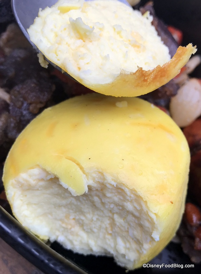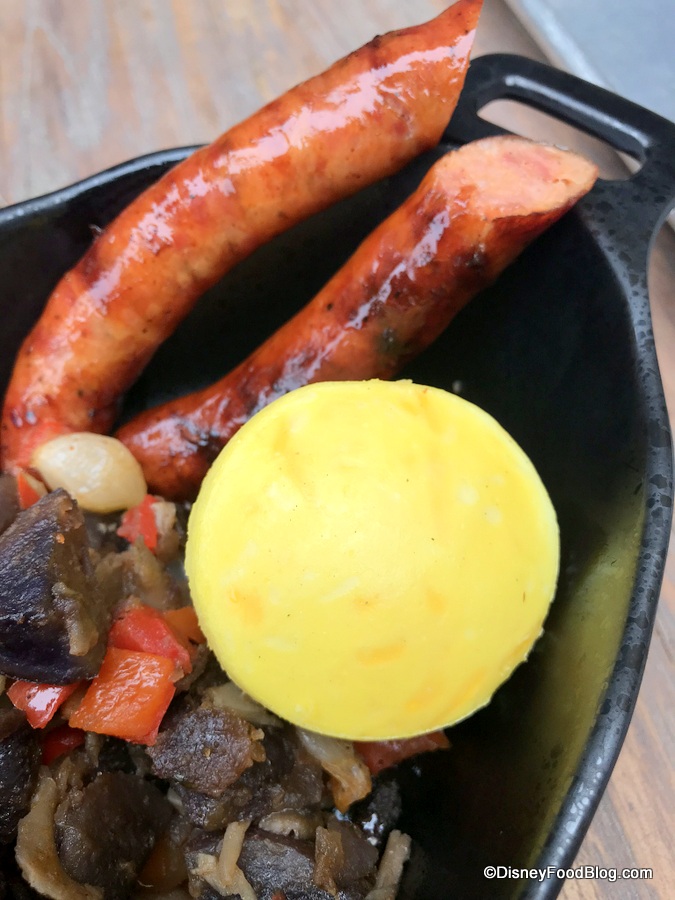 The visual star of the dish is the bright yellow round of egg, which to our eye appears to contain some shredded cheese. (We didn’t taste it so much, but you’ll want to check with the cast members upon ordering if you have cheese issues!)