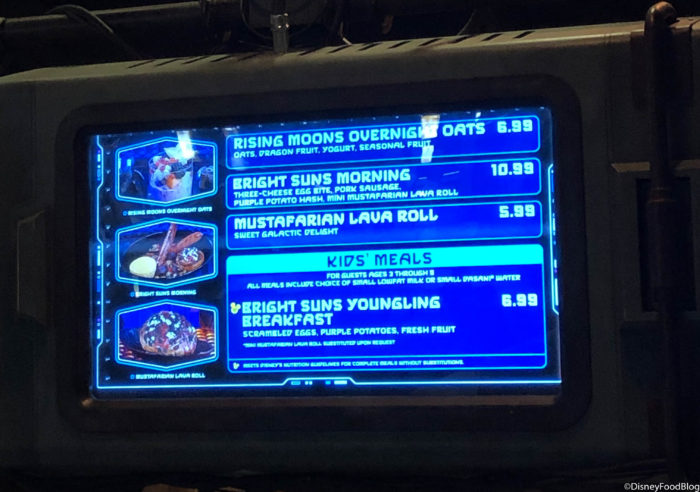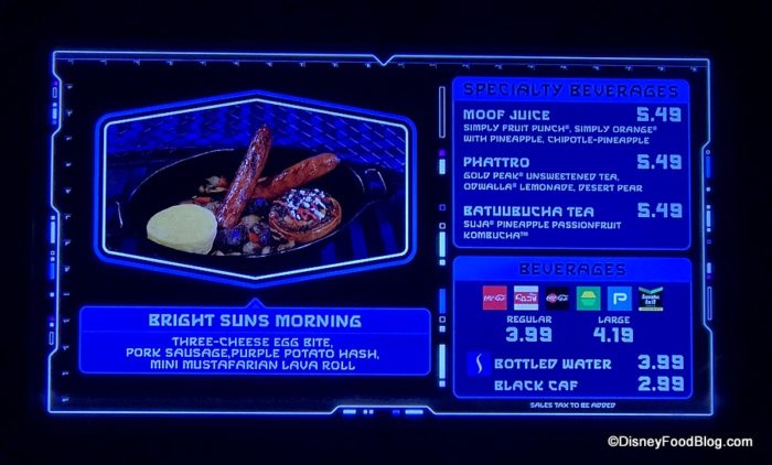 The menu for breakfast at Docking Bay is small, featuring just three entrees plus one kids’ breakfast item. Unsurprisingly, these items all have an interesting twist that makes them unique to Batuu.